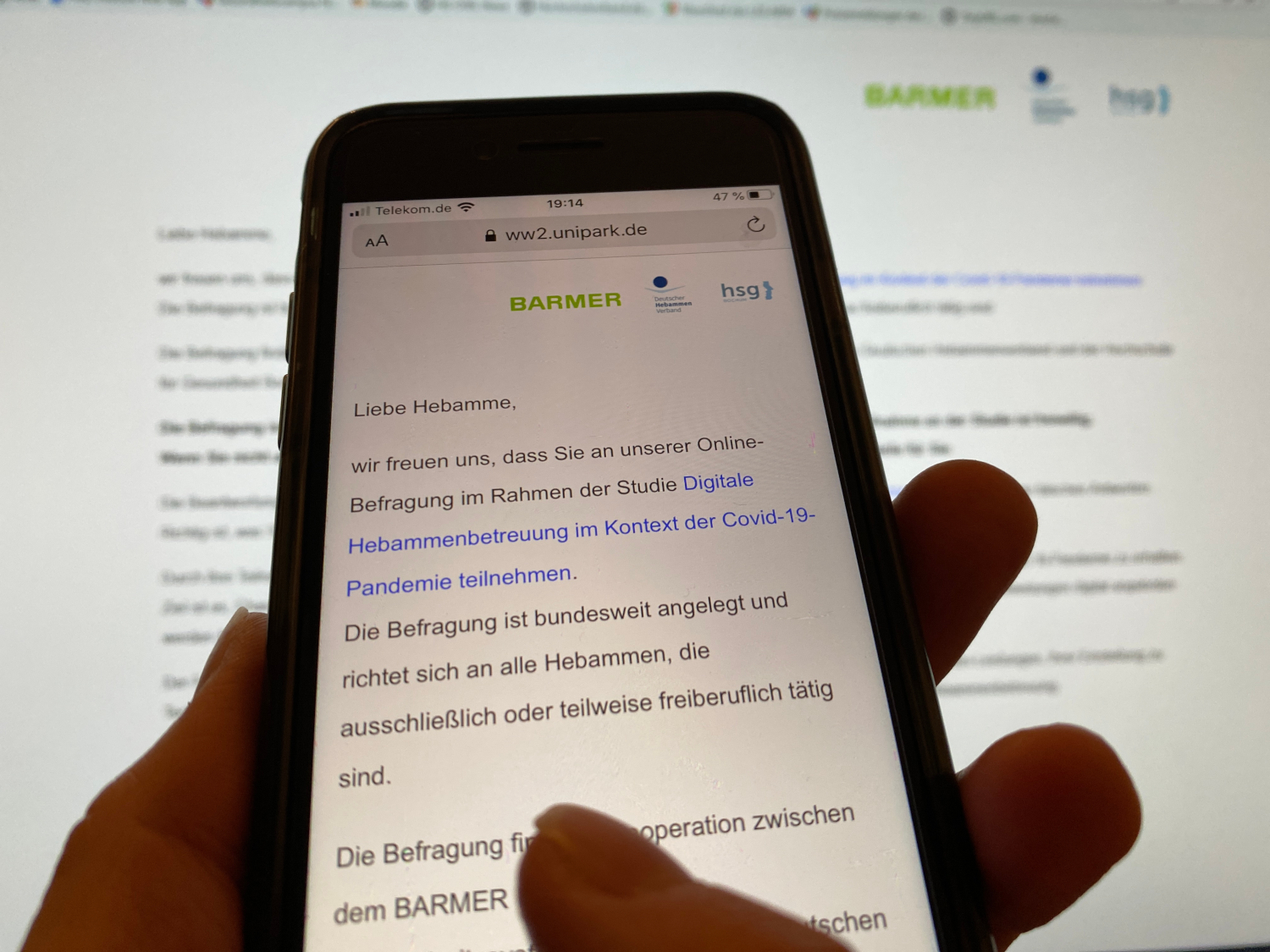 An der anonymen Online-Befragung, die etwa 20 Minuten beansprucht, können freiberuflich tätige Hebammen bundesweit teilnehmen. Zudem werden Frauen, die zwischen April und November 2020 ein Kind geboren haben und bei der Barmer versichert sind, teilnehmen. Diese werden direkt von der Krankenkasse kontaktiert.