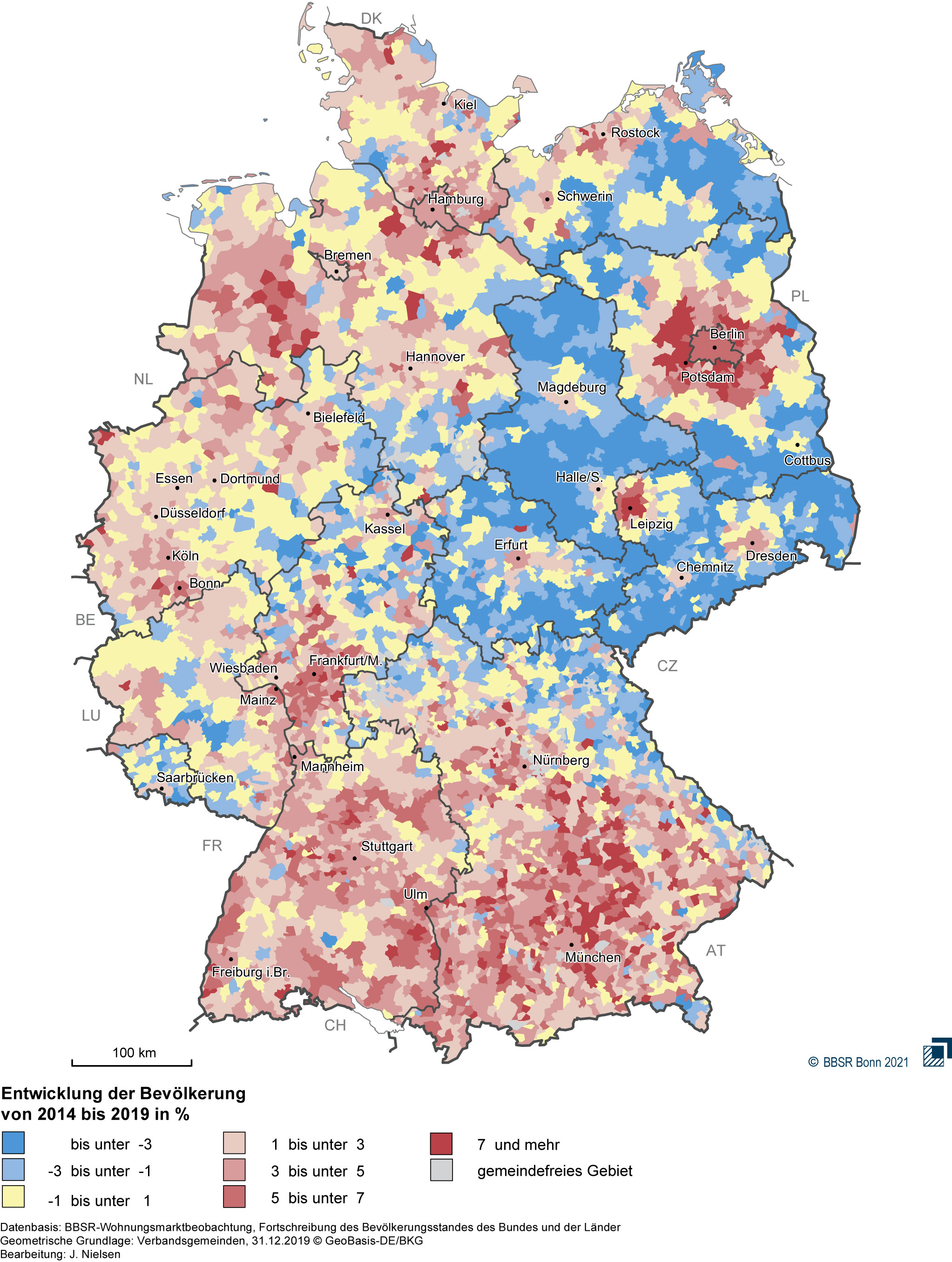 Wachsende Städte und Regionen erleben durch hohe Wanderungsgewinne eine stark wachsende Nachfrage nach Wohnraum. Die Bevölkerung der kreisfreien Großstädte wuchs im Zeitraum 2010 bis 2019 um 1,7 Millionen Einwohner (+7,5 Prozent). Dabei sind die Binnenwanderungssalden in einigen Großstädten wie München, Frankfurt am Main und Dresden wegen höherer Fortzüge ins Umland negativ. Andere Großstädte wie Potsdam, Leipzig und Ingolstadt wachsen durch vermehrte Zuzüge, besonders aus dem Inland. Die Bevölkerungsverluste in strukturschwachen ländlichen Räumen konnten durch die Außenzuzüge der letzten Jahre verringert werden, dennoch bleibt hier der Umgang mit Leerstand eine Herausforderung. Nach BBSR-Berechnungen standen im Jahr 2018 schätzungsweise 1,7 Millionen Wohnungen in Deutschland leer. Das entspricht 4,2 Prozent des Wohnungsbestands.