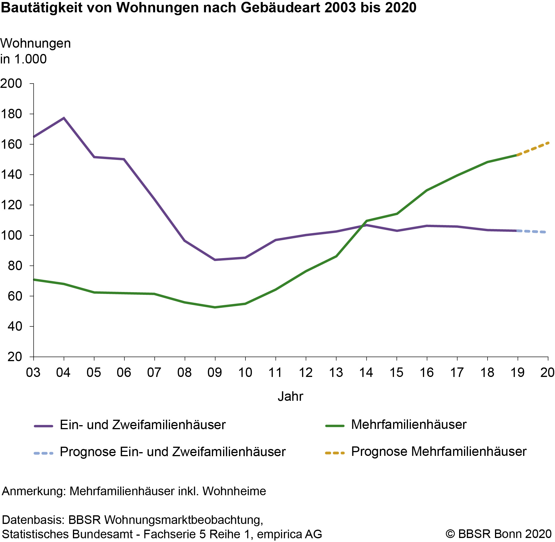 Die Dynamik bei den Baufertigstellungszahlen wird fast ausschließlich von einem starken Anstieg der für den Mietwohnungsbau entscheidenden Fertigstellungen im Geschosswohnungsbau getragen. Mit rund 153.000 Wohnungen wurden 2019 fast dreimal so viele Wohnungen in neu errichteten Mehrfamilienhäusern fertiggestellt wie 2009. Für 2020 werden rund 161.000 fertiggestellte Wohnungen in neu errichteten Mehrfamilienhäusern (inkl. Wohnheime) prognostiziert. Die Baufertigstellungen von Wohnungen in neu errichteten Ein- und Zweifamilienhäusern liegen in den letzten Jahren bei etwas über 100.000 Wohneinheiten. Komplettiert werden die Baufertigstellungen durch Baumaßnahmen an bestehenden Gebäuden (2019: ca. 32.000 Wohnungen). Der Anteil des Geschosswohnungsbaus ist mittlerweile auf 59 Prozent der gesamten Wohnungsneubautätigkeit gestiegen.