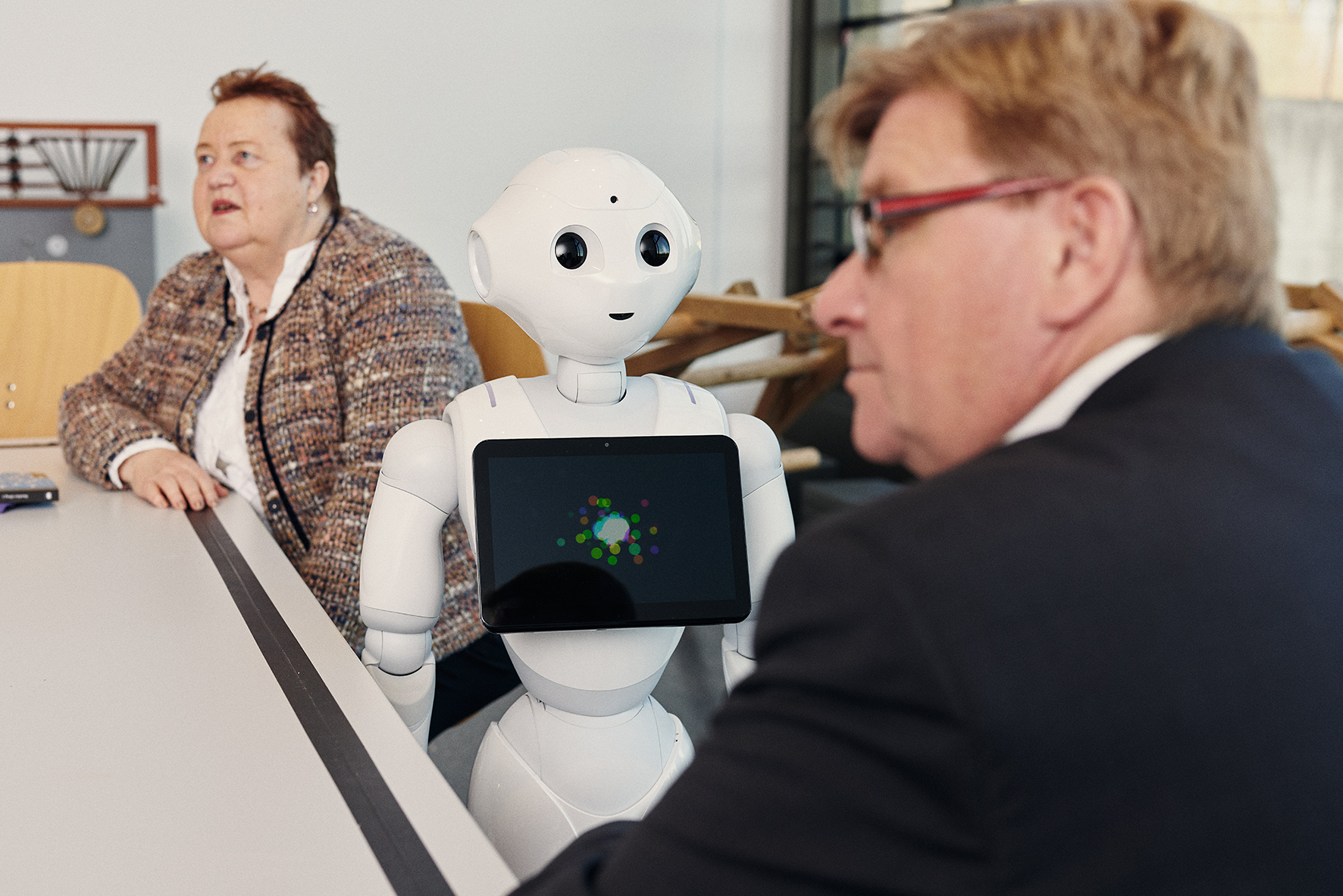 Für das Fotoshooting zum Thema haben sie und Kollege Benning sich einstweilen Pepper ausgeliehen, einen japanischen „Social Robot“, der bereits an der Fachhochschule Bielefeld eingesetzt wird. Pepper ist weltweit der erste Roboter, der soziale Interaktion mit Menschen simulieren kann. Dies geschieht über Mimik, Gestik und einfache verbale Kommunikation. Im Labor Robotik des Fachbereiches Ingenieurwissenschaften und Mathematik der FH Bielefeld werden unter der Ägide von Prof. Dr. Martin Hülse und M. Eng. Andreas Kirsch auf Pepper zum Beispiel Algorithmen zum Erlernen der Hand-Auge-Koordination getestet. Auch im experiMINT Schüler*innenlabor „arbeitet“ ein Exemplar. Um das Thema Rechtsfragen zu veranschaulichen, hatte Pepper beim VIVA-Shooting eigens ein paar Paragraphenzeichen auf seinem Bauchdisplay aufgerufen. Über Rechtsfragen freilich konnte man sich nicht mit ihm unterhalten. Vielleicht wird VIVA da schon weiter sein...