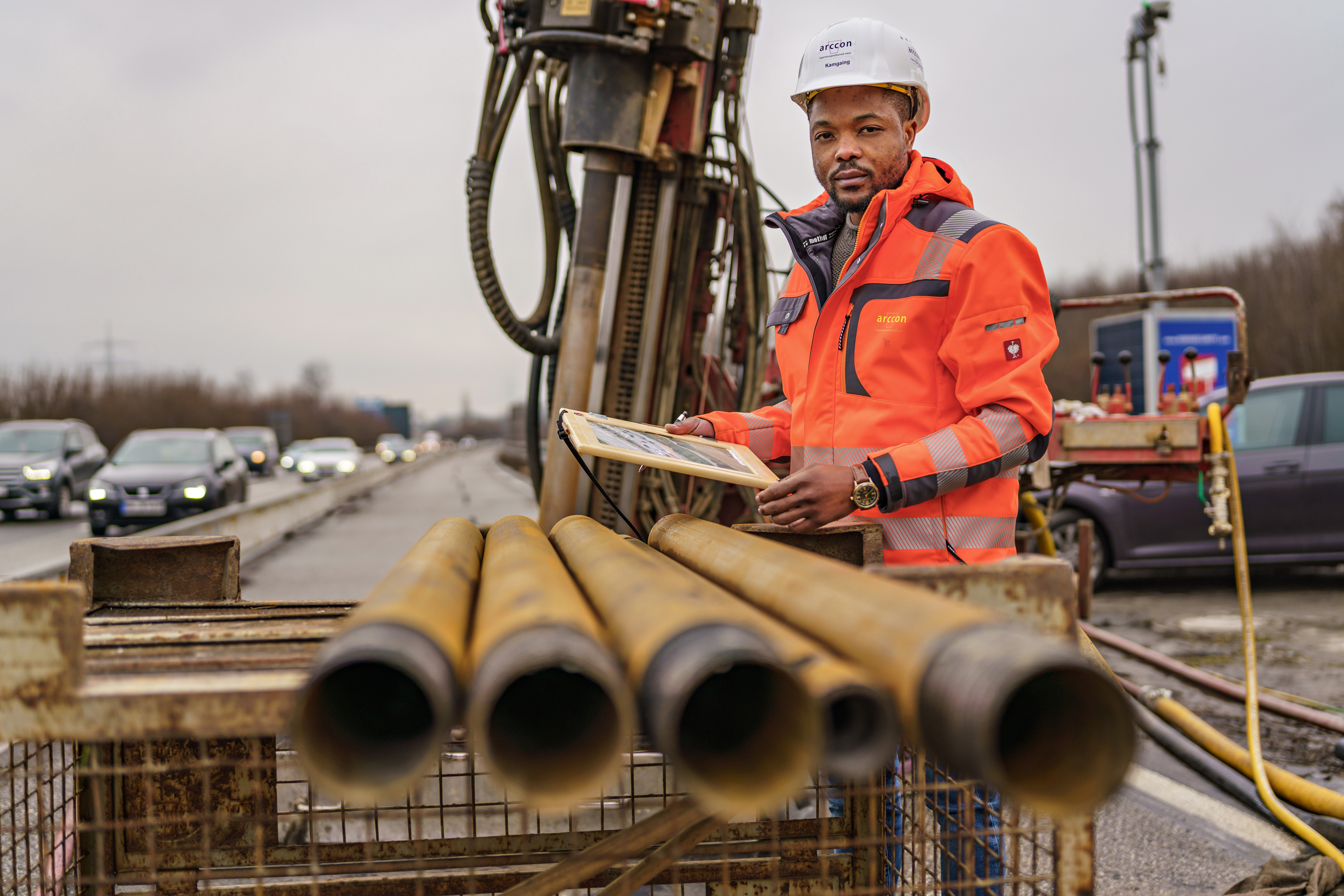 Baustellen, Sperrungen, verengte Fahrbahnen: Schon seit Ende März 2020 werden Autofahrer, die das Autobahnkreuz Dortmund/Witten passieren, auf die Geduldsprobe gestellt. Doch die Sanierungsarbeiten an der A44 sind dringend erforderlich, sagt Ingenieur Cedric Kamgaing Kamdom: „Zuletzt haben wir einen Hohlraum aufgespürt und verfüllt, der rund zehn Meter hoch und drei Meter breit war – etwa so groß wie ein Einfamilienhaus. Und das ziemlich knapp unter der Fahrbahndecke“, erklärt der 30-Jährige, der beim zuständigen Ingenieurbüro arccon als Projektleiter arbeitet. Inzwischen haben die Experten hier rund 800 Tonnen Betongemisch in den löchrigen Untergrund geleitet, um ihn zu sichern. Das entspricht rund 30 vollen Sattelzügen.