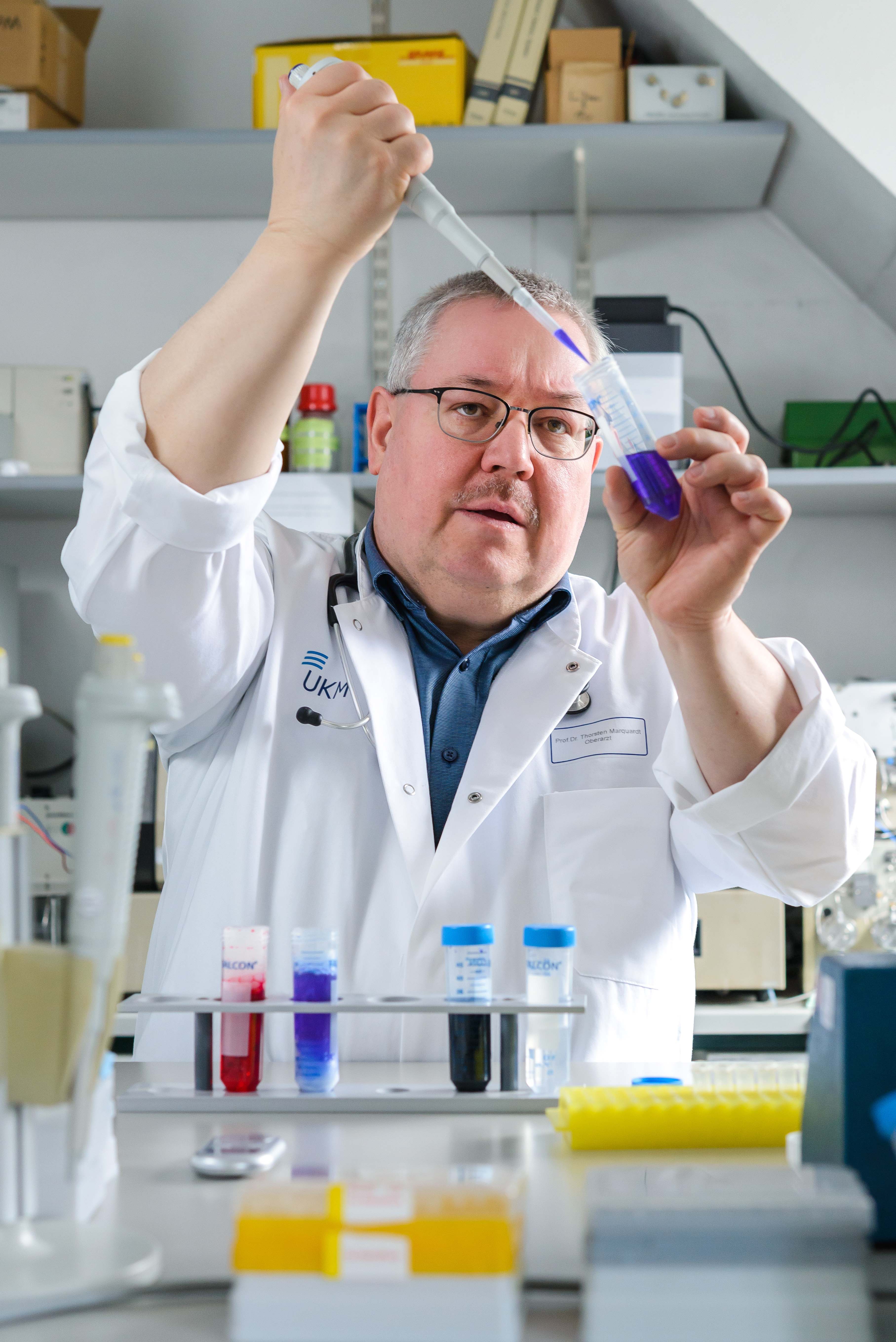 Der in Münster entwickelte Therapieansatz beruht in erster Linie auf der Annahme, dass die Blockade eines weiteren Chloridkanals (TMEM16A) zur Verringerung der Schleimproduktion bei Mukoviszidose-Patienten führen könnte. Bei der Entwicklung dieser Arbeitshypothese kam den Münsteraner Ärzten, wie so oft, der Zufall zur Hilfe, wie Thorsten Marquardt erläutert: „Eltern stellten ein wenige Monate altes Mädchen mit einer Gedeihstörung und Bauchproblemen vor, das leider in der Folge verstarb. Wir entdeckten bei ihr und ihrem älteren Bruder eine bis dato unbekannte neue Erkrankung, die zu einem Verlust der TMEM16A-Funktion führte. Die Überraschung: der Verlust von TMEM16A führte auch zu einem Verlust der CFTR- Funktion – ohne jedoch, dass zu diesem Zeitpunkt Symptome der Mukoviszidose auftraten. Da wurden wir natürlich hellhörig – schließlich erlebten wir nicht zum ersten Mal, dass die Neudiagnose einer Seltenen Erkrankung hilft, eine andere besser zu verstehen.“