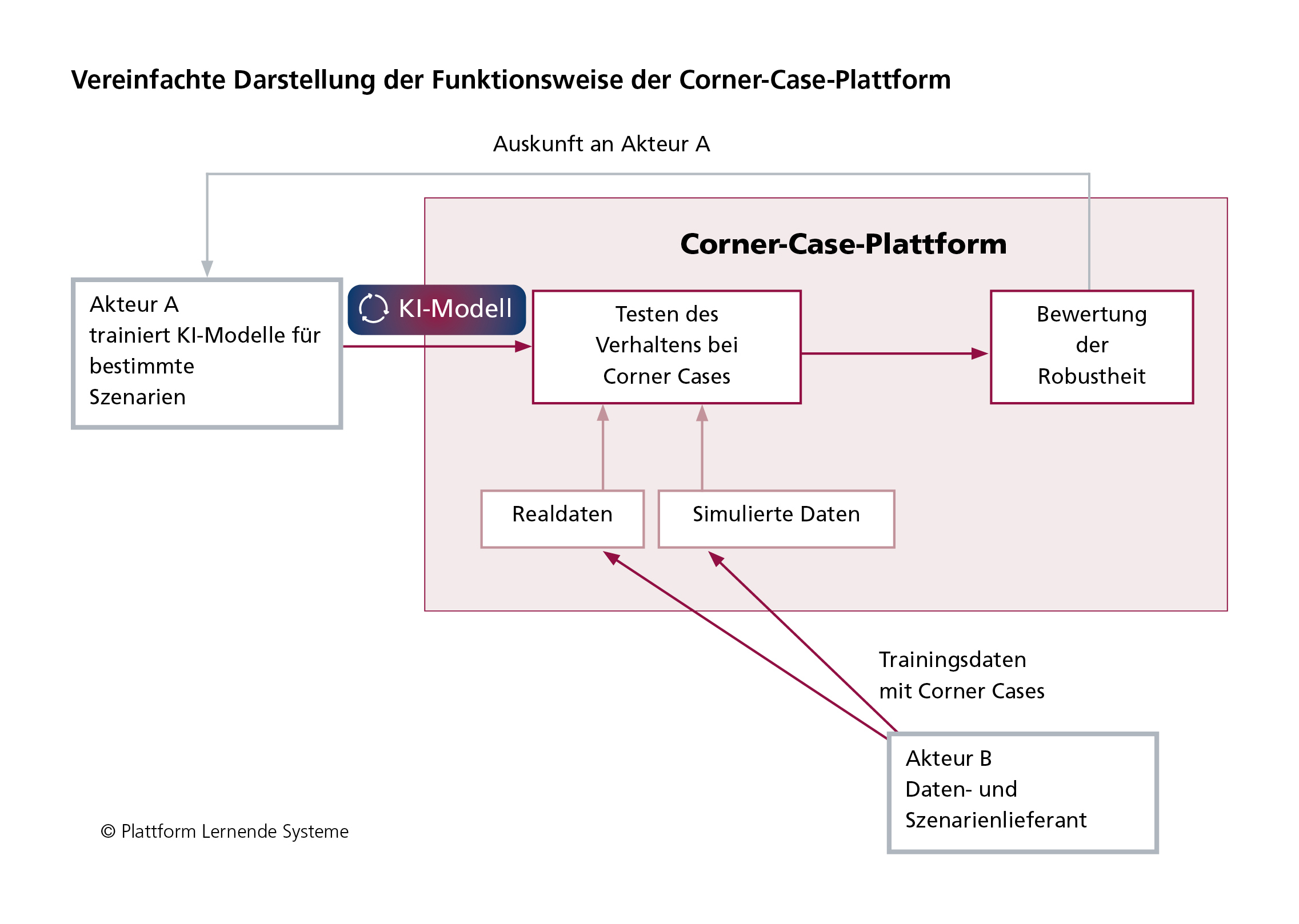 Die Daten zu den seltenen Sonderfällen sollten auf der KI-Plattform Akteuren entlang der gesamten Wertschöpfungskette zur Verfügung stehen, so die Empfehlung des Whitepapers. KI-Modelle könnten hochgeladen werden, und das Verhalten der KI-Systeme hinsichtlich dieser Szenarien überprüft werden. Im Anschluss könnten die Fahrzeughersteller ihre Modelle aktualisieren und wiederum in ihren Flotten verteilen. Denkbar ist auch, ein Nachtraining der KI-Systeme direkt auf der Plattform durchzuführen und zertifizierte Updates über die Plattform zu verteilen, so die Autorinnen und Autoren. Die Plattform ermögliche damit den Austausch sowohl zwischen Akteuren, die ihre Modelle testen und verbessern möchten, etwa Fahrzeughersteller, als auch zwischen Akteuren, die über Corner Case-Szenarien oder Trainingsdaten verfügen, mit denen Modelle robuster gestaltet werden können.