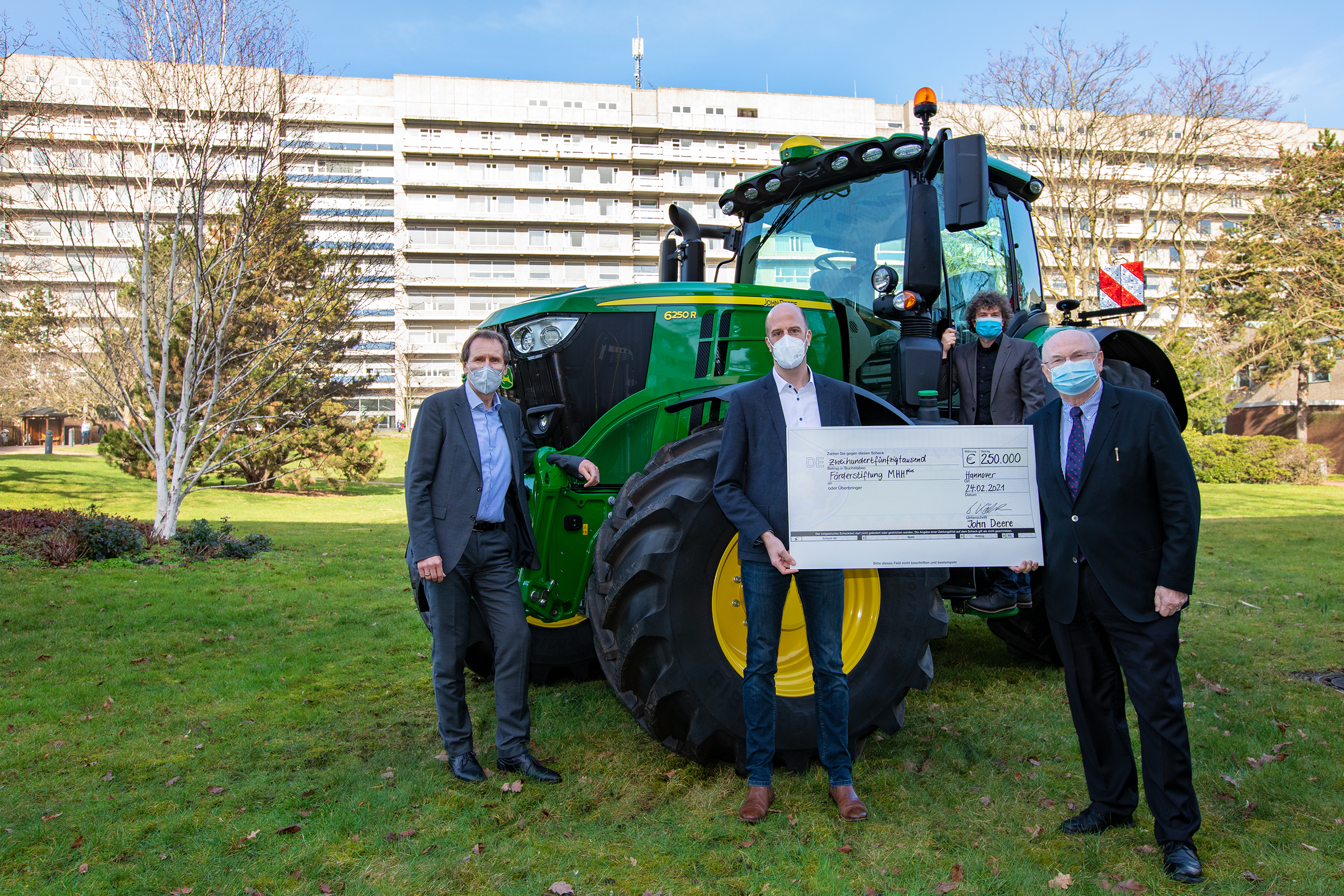 There is great joy at the MHH. "The MHH is researching vaccines, the damage to human neurons caused by SARS-CoV-2 and the effects of the lockdown on mental health, to name just a few examples. In any case, the donation from John Deere makes a valuable contribution," says MHH President Prof. Dr. Michael P. Manns. At present, 102 scientists from 43 institutes and clinics of the MHH are working on 120 projects on SARS-CoV-2 and COVID 19. Dr Eckhard Schenke, Chairman of the Förderstiftung MHH plus, to which the donation was made, emphasises: "We are observing a significantly increased willingness to donate during the pandemic, not only in the area of corona research, but also in general. However, an amount of this size is still a pleasant exception.