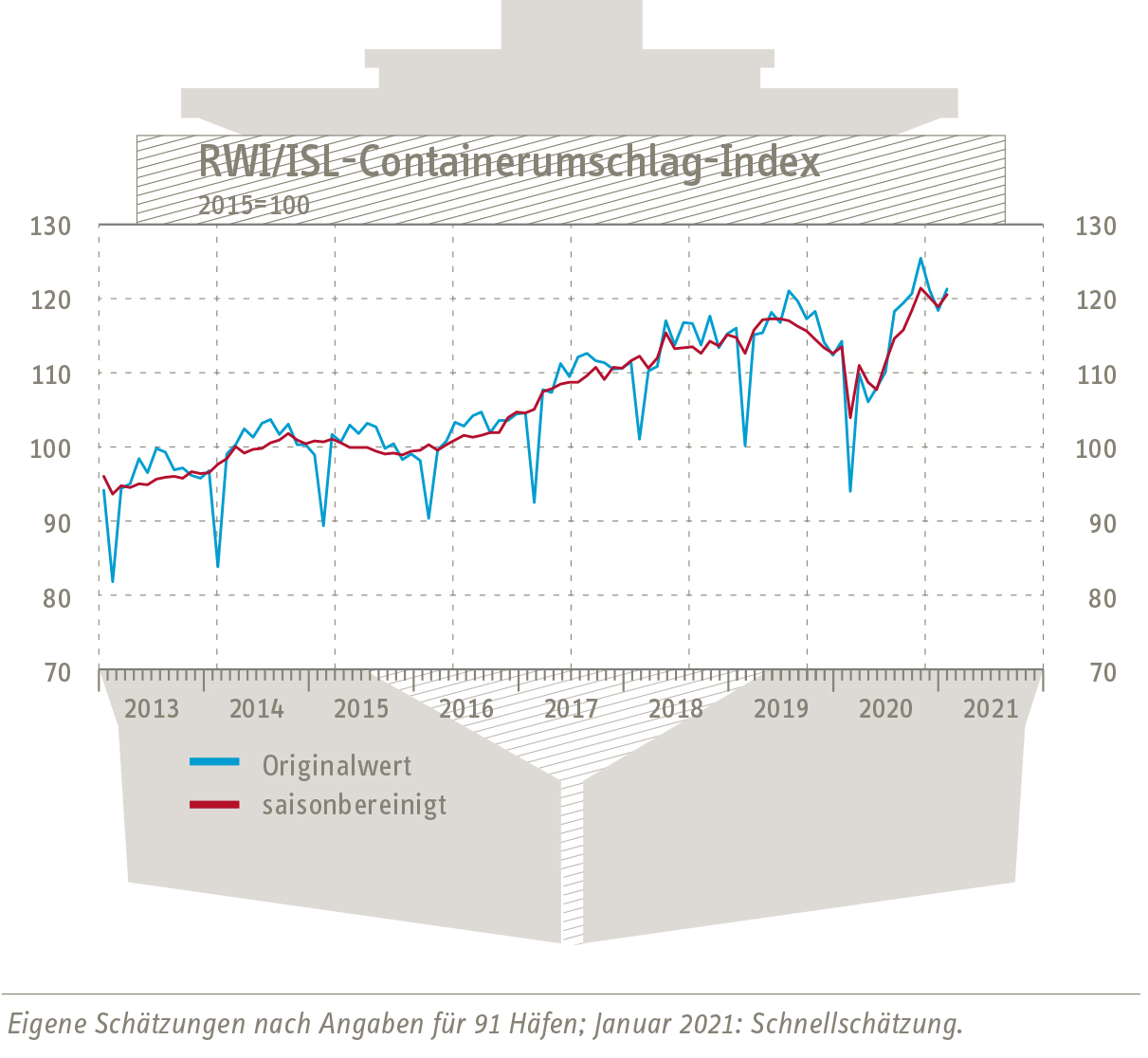 Der Containerumschlag-Index des RWI – Leibniz-Institut für Wirtschaftsforschung und des Instituts für Seeverkehrswirtschaft und Logistik (ISL) ist nach der aktuellen Schnellschätzung im Januar leicht auf nun 120,8 gestiegen. Der Containerumschlag scheint damit auf den Wachstumspfad von vor der Corona-Krise zurückzukehren.