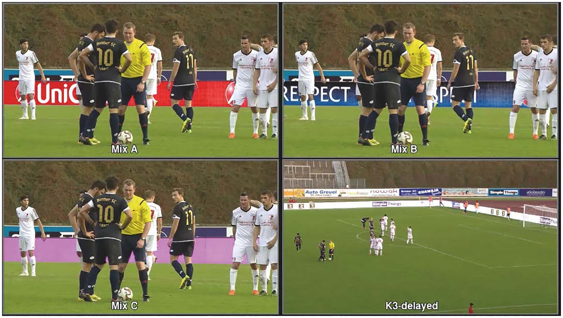 This is how Ulrich Nütten, head of the Media Engineering department, explains the procedure developed at the institute: “The streams on the LED boards consist of a sequence of individual images, each of which is displayed for 20 milliseconds. We shorten the display time to 18 milliseconds, and the board displays a solid magenta screen for the remaining two milliseconds. This flash of magenta is too quick to be perceived by the human eye. The TV camera’s recording timing and duration are set so that it only records these flashes. That means the camera doesn’t see the real advertisements, only the boards with the solid color. This is where chroma keying comes in. The magenta area in the image sent to the TV studio by the camera at the stadium is overlaid with new content. This creates an advertising stream that seamlessly blends into the TV image.” While spectators in stadiums see the actual perimeter advertisements, people watching on their TV sets are shown different advertisements. However, for them, it's as if the advertisements are displayed on the perimeter boards in the stadium. It doesn’t even pose a problem if one of the players stands in front of a board, or runs back and forth in front of it. “The technology is now so advanced that there's no fringing, color distortion, or blurriness in those situations,” says Nütten.