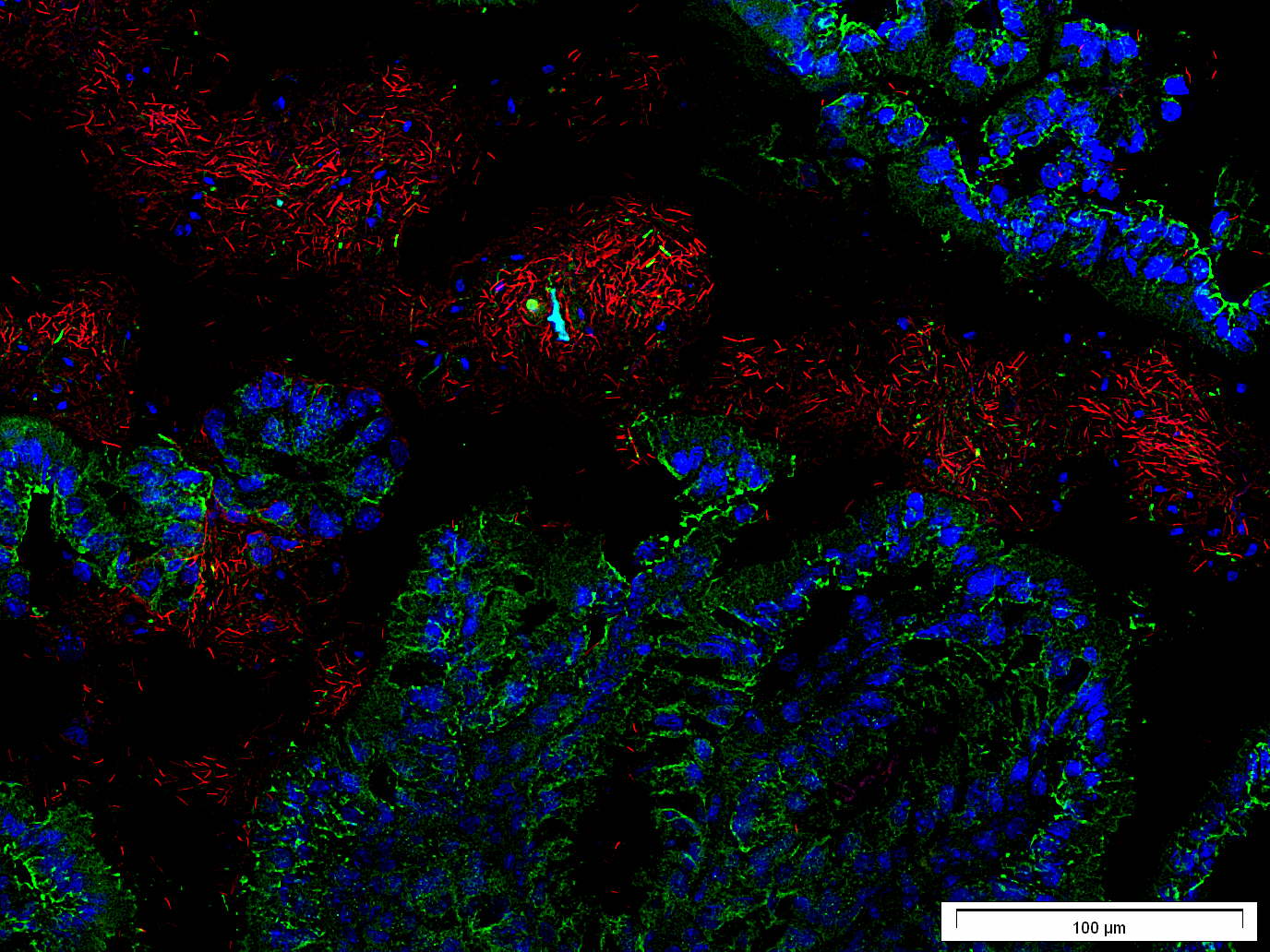 Bildunterzeile: Bakterien (rot) in direktem Kontakt mit Zellen der Darmwand (grün, Zellkern in blau). Bildquelle: Universitätsmedizin Mainz