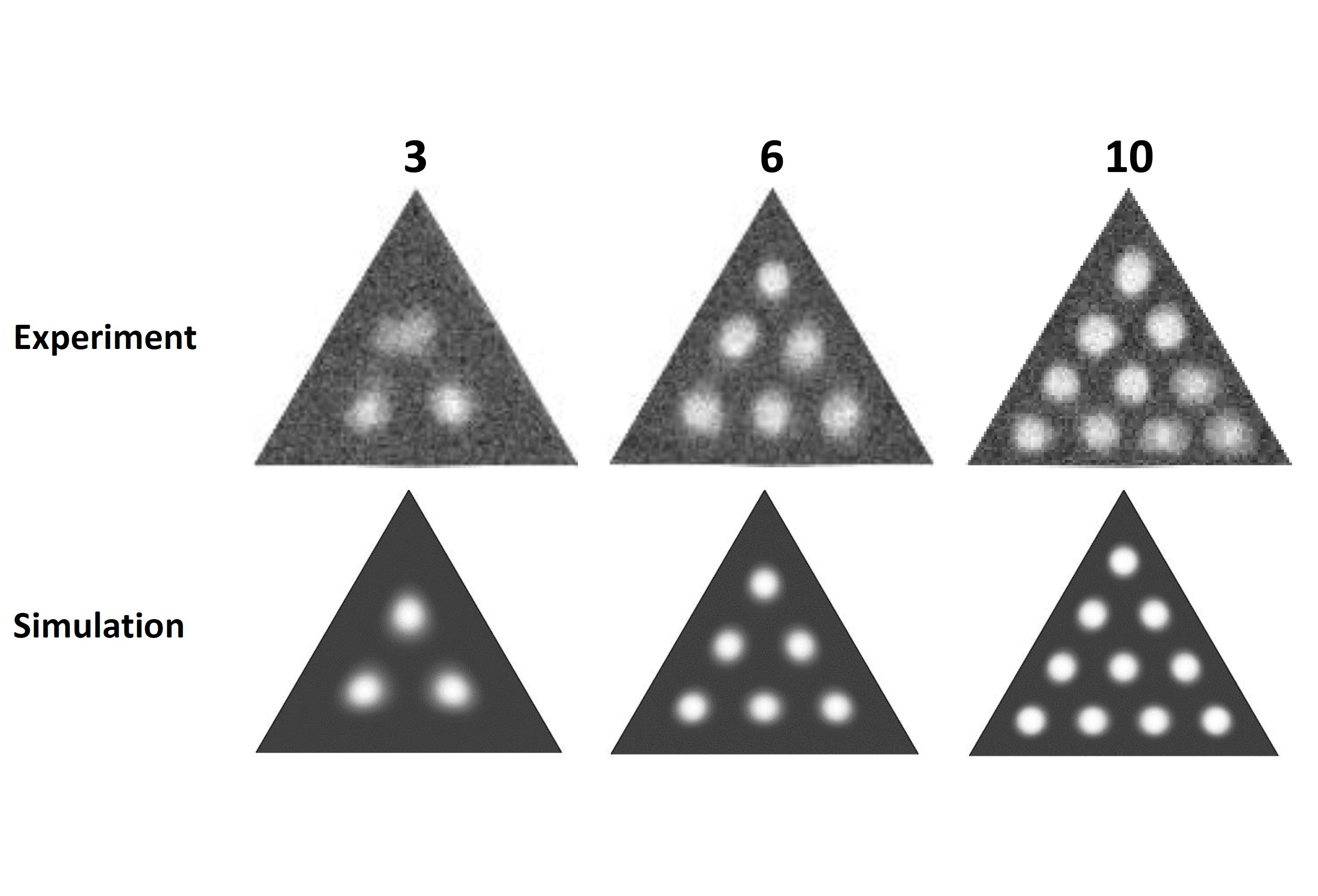 In a close collaboration between experimental and theoretical physicists at Johannes Gutenberg University Mainz (JGU), the research groups of Professor Mathias Kläui and Dr. Peter Virnau investigated the behavior of magnetic whirls within nanoscale geometric structures. In their work published in "Advanced Functional Materials", the researchers confined small magnetic whirls, so-called skyrmions, in geometric structures. Skyrmions can be created in thin metal films and have particle-like properties: They exhibit high stability and are repelled from each other and from specially prepared walls. Experiments and accompanying computer simulations showed that the mobility of skyrmions within these geometric structures depends massively on their arrangement. In triangles, for example, three, six, or ten skyrmions arranged like bowling pins are particularly stable.