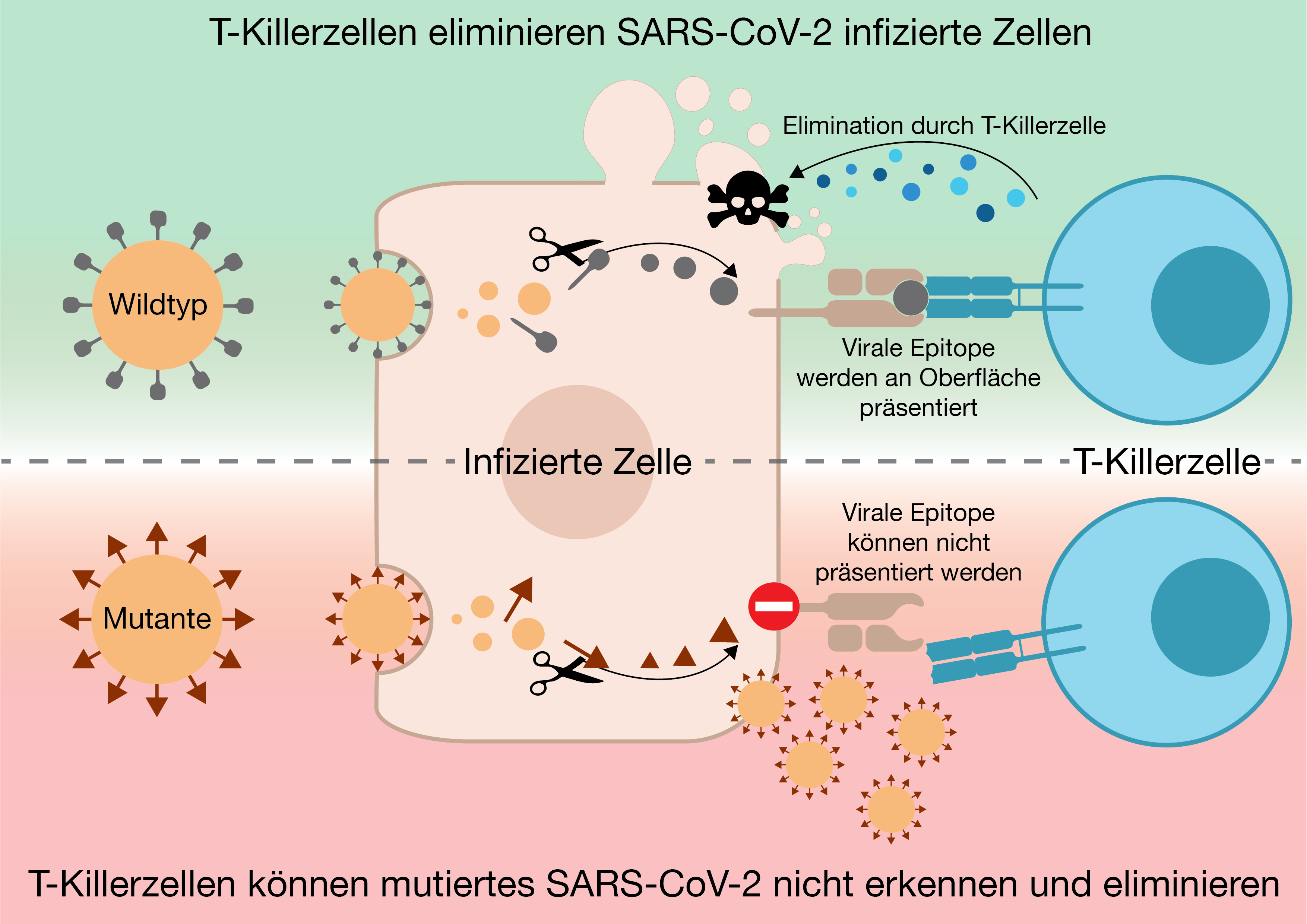 Nach einem Jahr Pandemie zeichnet sich für Wissenschaft und Medizin ein immer deutlicheres Bild davon, wie die Immunantwort Menschen vor SARS-CoV-2 schützt. Zwei Akteure spielen dabei eine zentrale Rolle: Antikörper und T-Killerzellen. Während Antikörper direkt an Viren andocken, um diese unschädlich zu machen, erkennen T-Killerzellen virale Eiweiß-Fragmente auf infizierten Zellen und töten diese in der Folge ab, um die Virusproduktion zu stoppen. Immer mehr Studien zeigen, dass sich SARS-CoV-2 durch Mutationen der Antikörper-Immunantwort entziehen kann und damit auch die Wirksamkeit von Impfstoffen beeinträchtigt. Ob solche Mutationen auch T-Killerzellen in ihrer Funktion beeinträchtigen, war bis jetzt nicht geklärt.