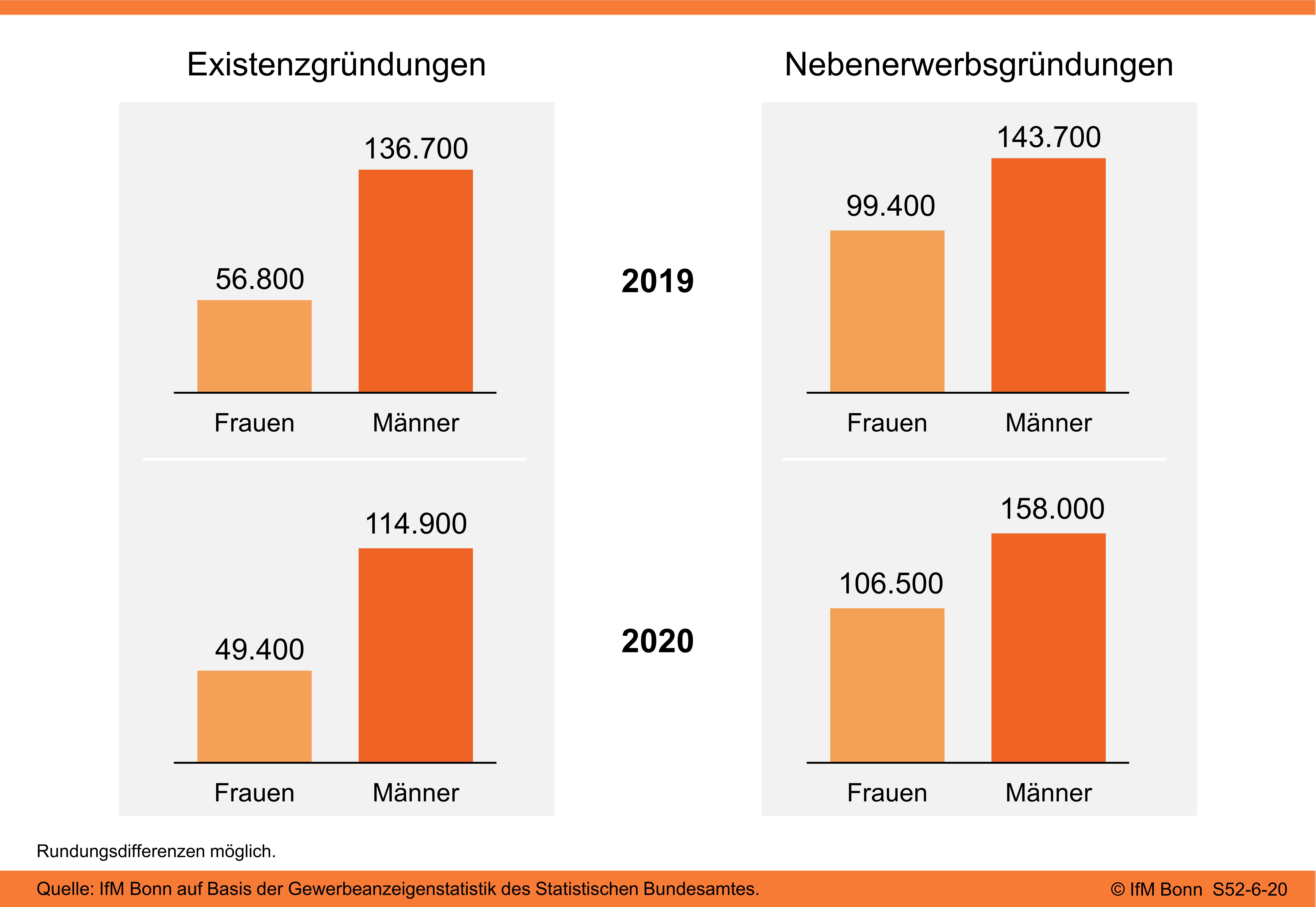 Die Existenzgründungen von gewerblichen Einzelunternehmen sind im Pandemiejahr 2020 insgesamt um rund 15 % gesunken. Rund 49.400 Frauen gründeten ein gewerbliches Einzelunternehmen im Haupterwerb und 106.500 im Nebenerwerb. Insgesamt gibt es weiterhin einen deutlichen Gender-Gap im gewerblichen Gründungsgeschehen.