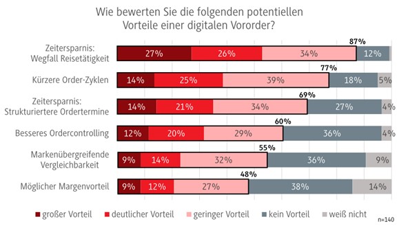 Der große Vorteil der digitalen Order ist eindeutig die Zeitersparnis, einmal durch den Wegfall der Reisezeit, andererseits durch eine bessere Strukturierung der Ordertermine. Reduziert sich der Aufwand für eine Order, kann häufiger geordert werden. Verkürzen sich die Orderzyklen, sinkt die Fehlerquote bei den Bestellungen und da-mit auch das Risiko für den Händler.