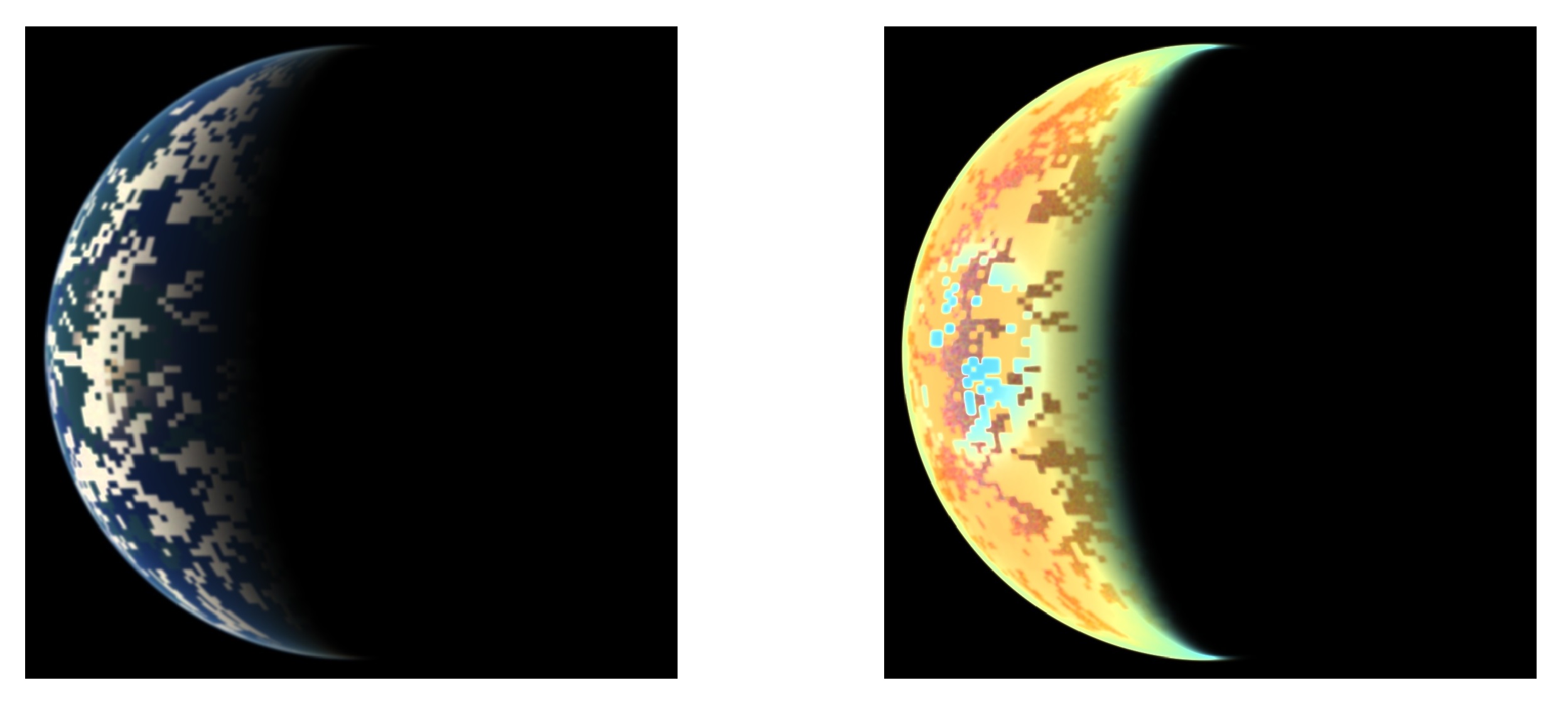 Bildunterschrift: Simulierte Ansichten eines erdähnlichen Planeten außerhalb unseres Sonnensystems mit Wolken, Landmassen und Ozeanen. Links ist das „normale“ Bild des Planeten zu sehen, rechts das Ergebnis des neuen Kieler Simulationsverfahrens. Es bezieht auch die Polarisation der Planetenstrahlung mit ein und enthält so noch weitere Informationen über dessen Beschaffenheit.