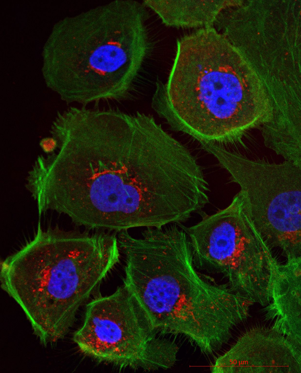 BU: Mikroskopische Ansicht menschlicher Eierstockkrebszellen – durch die Immunfluoreszenzfärbung erscheinen Zellkerne blau und das Zellskelett grün. © Uniklinikum Dresden/Klinik für Frauenheilkunde und Geburtshilfe