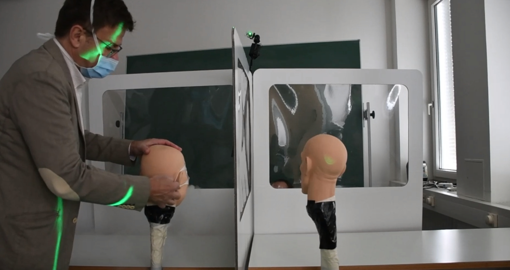 „Um die Luftströmung besser sichtbar zu machen, wird der Nebel mit einem grünen Linienlaser angestrahlt.“ Epple spult ein wenig vor: „Besonders eindrucksvoll zeigt sich das in den Nachtaufnahmen.“ Leuchtendes Grün sprüht jetzt aus einem Gummikopf gegen das Folienfenster einer Aufstellwand, es steigt nach oben, schwappt aber nicht über die Kante, sondern fällt in einer halbkreisförmigen Bewegung zurück. Der Effekt ist unabhängig davon, ob eine Maske getragen wird. „Auch ohne Absaugung erzielen Trennwände eine große Schutzwirkung, die besser als das Tragen des Mund-Nasenschutzes ist.“ Zumindest für eine gewisse Zeit, das sei wie bei den Masken: Irgendwann muss im Raum ein Luftwechsel stattfinden.