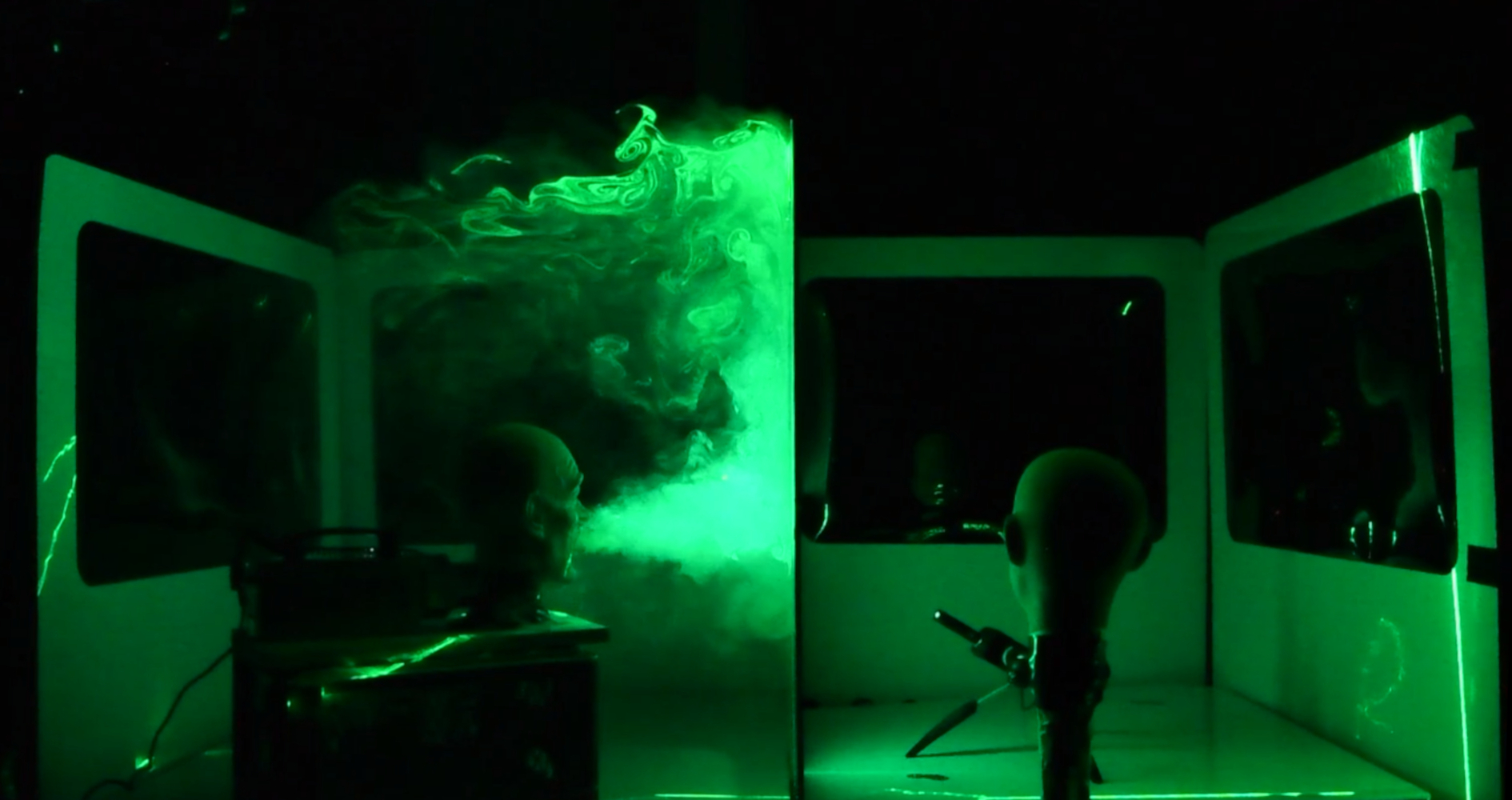 Im Film mit der Versuchsanordnung laufen Epples wissenschaftliche Mitarbeiter Michael Steppert und Michael Florschütz durchs Bild und verändern immer wieder die Szenerie: „Wir haben Tests mit Trennwänden links und rechts gemacht, dann zusätzlich mit einer Trennwand vorn, so dass sich eine U-Form ergibt, mit einer Umlenkleiste und mit Absauganlage.“ Epple spult wieder ein Stück: Peter Dahlem taucht am linken Bildschirmrand auf, geht zu einem der Plastikköpfe und nimmt diesem die Maske ab. Der Nebel sprudelt nun intensiver.