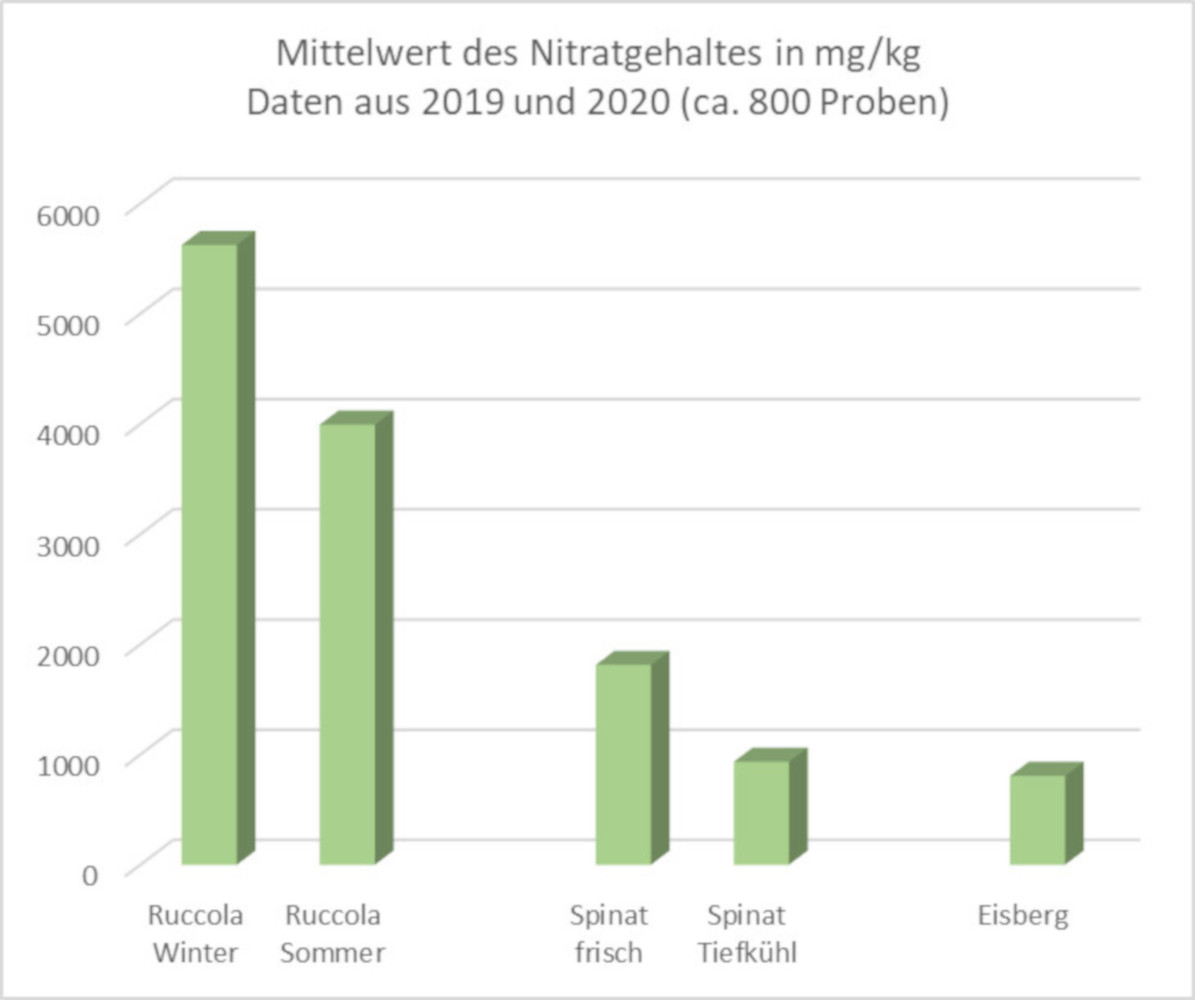Wie wichtig die Zusammenführung und Aufbereitung von relevanten Daten auch aus der Lebensmittelkontrolle sind, machen z. B. die neuesten Untersuchungen auf Nitrat in verschiedenen Salaten und Spinat deutlich. Die Auswertung von ca. 800 Proben aus den letzten beiden Jahren zeigt, dass vor allem Rucola weiterhin deutlich mit Nitrat belastet ist. Die meisten Überschreitungen der Höchstgehalte (20 Prozent) wurden dabei in italienischem Rucola gefunden. Aber auch bei frischem Spinat wurden in 7 % der Proben Höchstmengenüberschreitungen mit Nitrat festgestellt. Tiefkühlspinat ist dagegen vergleichsweise weniger mit Nitrat belastet; hier gab es in den Proben keine Überschreitungen. Das gilt auch für den untersuchten Eisbergsalat. Gerade im Winter sollte also auf den Verzehr nitratärmerer Salate geachtet werden, um ein Zuviel an Nitrat zu vermeiden. Im Körper können sich sonst krebserregende Nitrosamine bilden.“