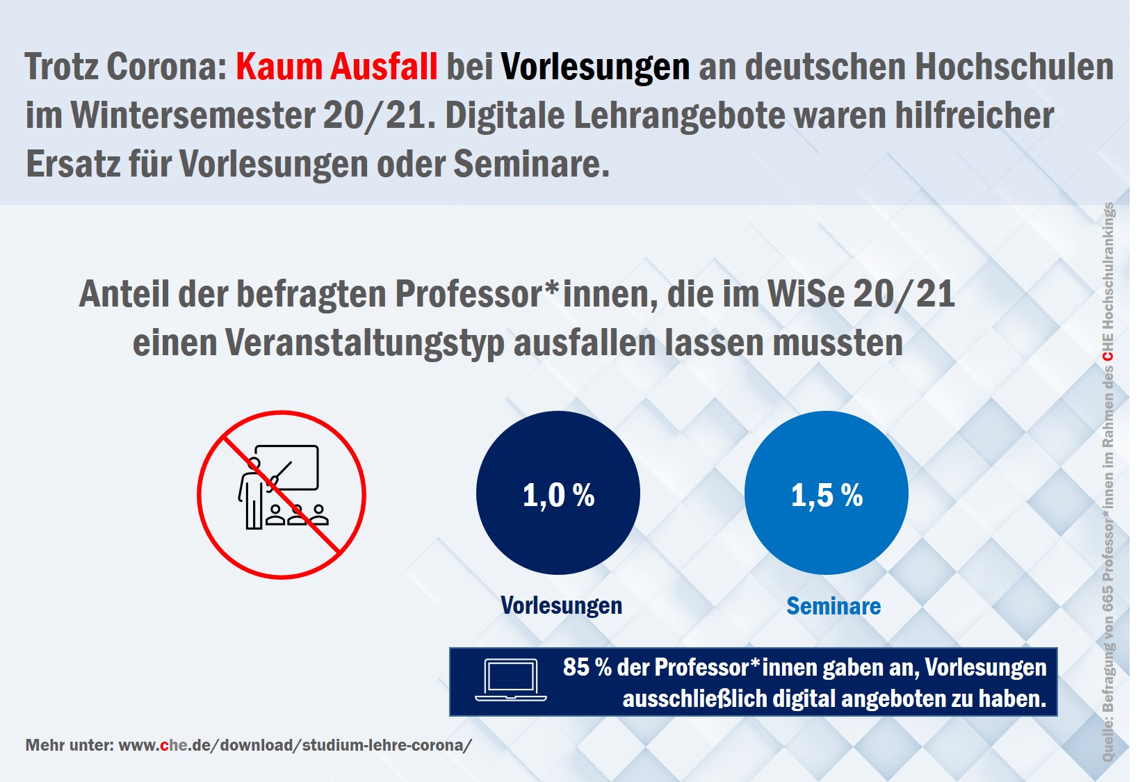 Die Auswirkungen der Corona-Pandemie betreffen auch den Studienalltag. Dennoch konnten die deutschen Hochschulen ihren Vorlesungs- und Prüfungsbetrieb fast vollständig aufrechterhalten. Dies zeigt eine aktuelle Befragung von mehr als 27.000 Studierenden und 665 Professor*innen durch das CHE Centrum für Hochschulentwicklung. Für die Zukunft wünschen sich Lehrende und Studierende, weiter verstärkt auf digitale Lehrelemente zu setzen. Nur jede fünfte Lehrkraft wünscht sich eine Rückkehr zur reinen Präsenzlehre.