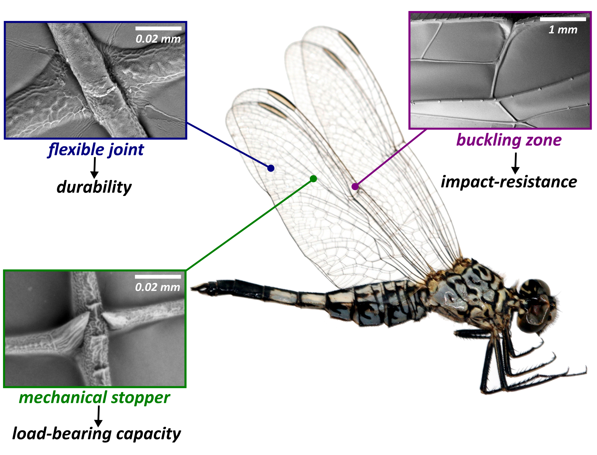 Caption: Three structural design elements of the wing structure ensure that collisions and wind forces cannot harm insects during their flight: flexible joints, mechanical stoppers and buckling zones.