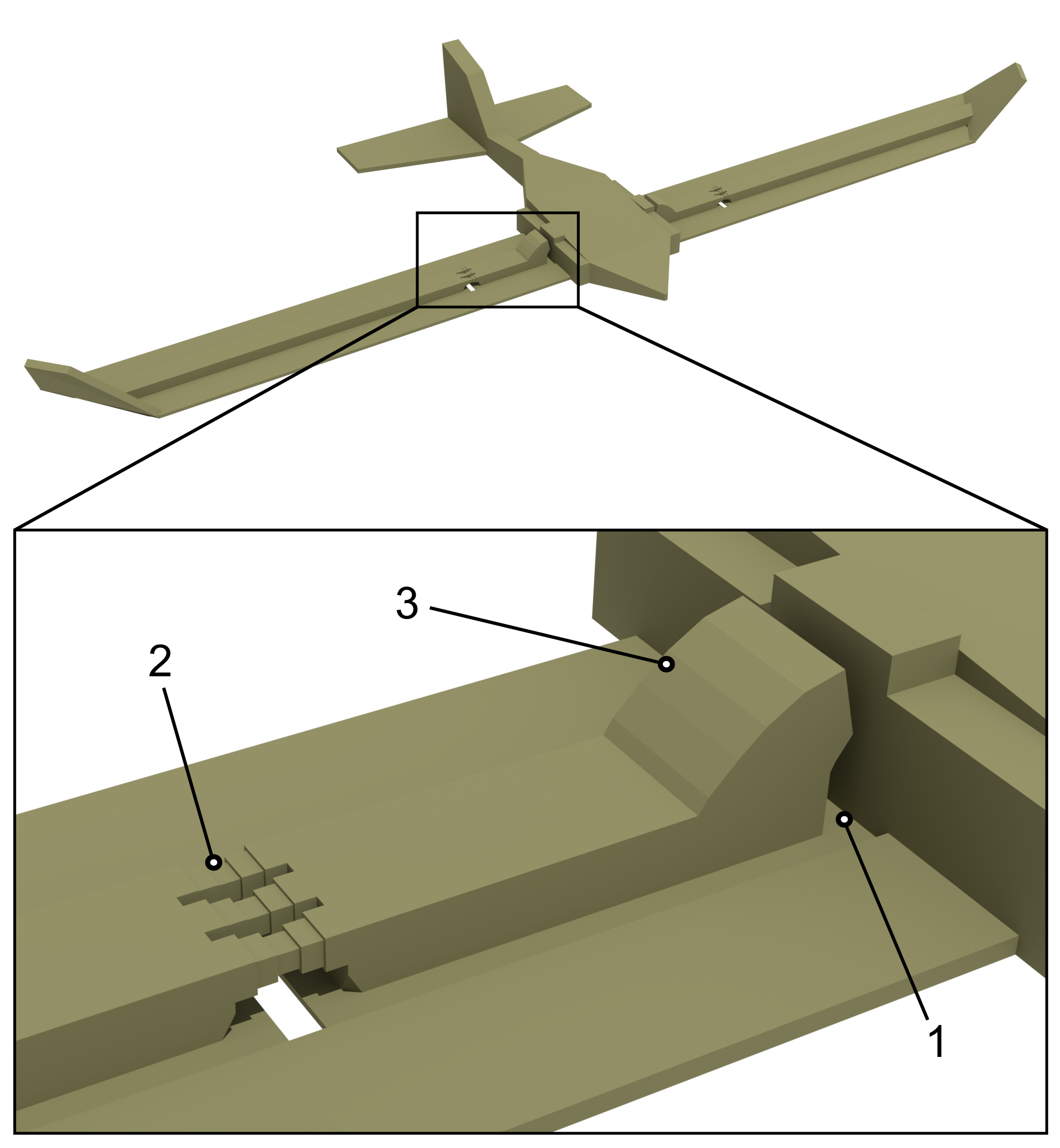Caption: The scientists also applied the design strategies of the insect wings to an aircraft model: (1) flexible joints, (2) buckling zones and (3) mechanical stoppers.