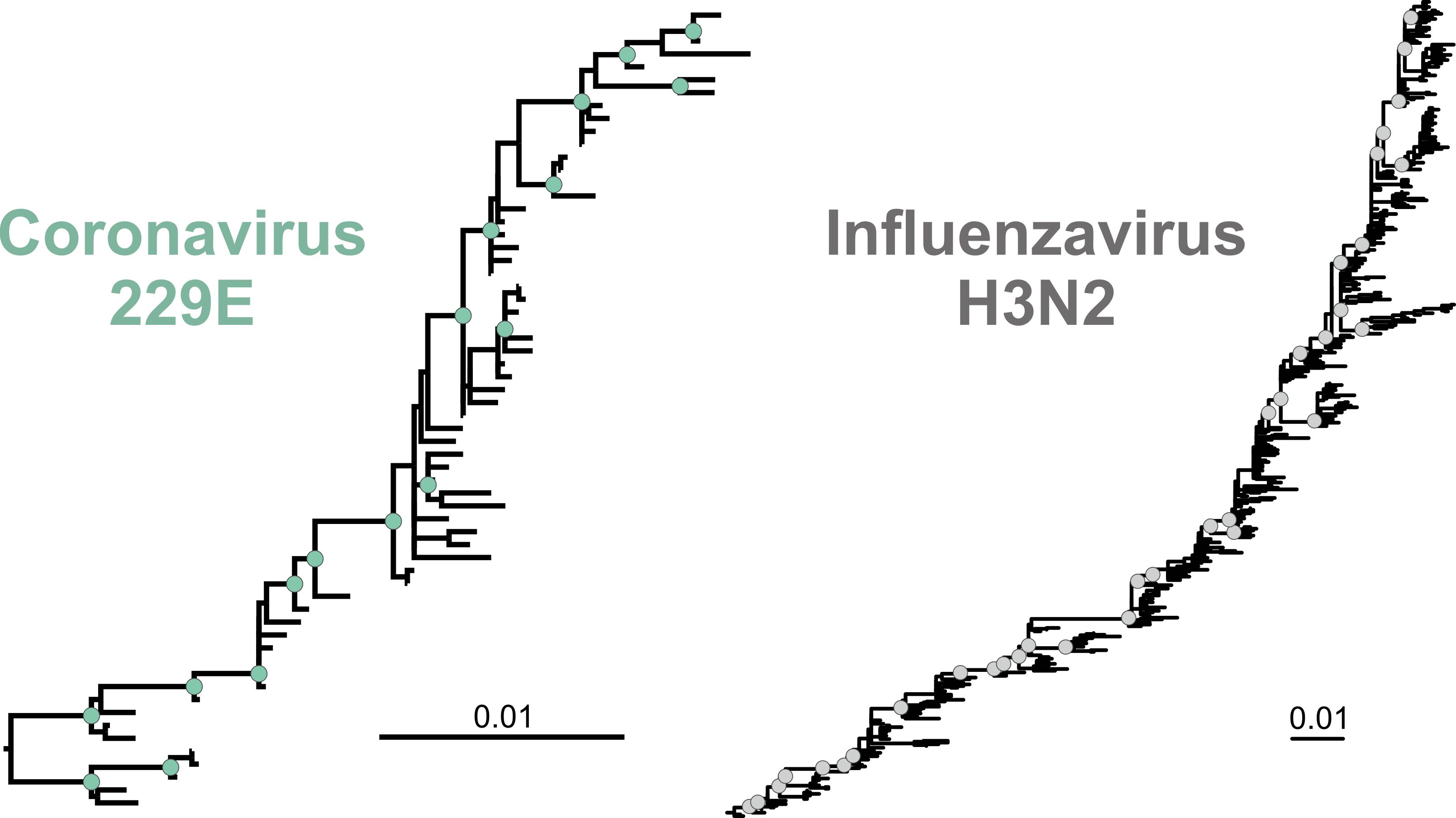 Für die Studie verfolgte das Forschungsteam nach, wie sich das Spike-Gen der beiden am längsten bekannten Coronaviren 229E und OC43 über die vergangenen rund 40 Jahre verändert hat. Dazu verglichen die Wissenschaftlerinnen und Wissenschaftler die Sequenzen aus unterschiedlich alten Proben, die in einer Gendatenbank hinterlegt worden waren, und entwickelten anhand der über die Zeit entstandenen Mutationen einen Stammbaum für beide Coronaviren. Zum Vergleich betrachteten die Forschenden den Influenza-Stamm H3N2, der sich besonders effizient der menschlichen Immunreaktion entzieht.