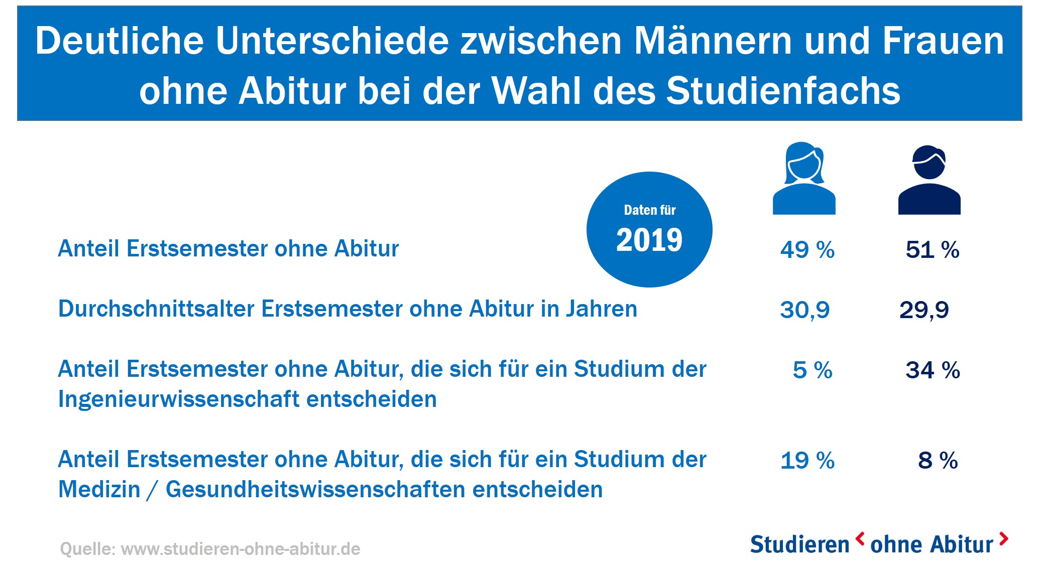 Dabei entdecken zunehmend auch Frauen diesen Weg für sich. Dominierten 2015 noch die männlichen Erstsemester ohne Abitur, hat sich der Anteil weiblicher Erstsemester aktuell auf rund 49 Prozent gesteigert. Dabei zeigen sich deutliche Unterschiede bei der Fächerwahl. So schreiben sich beruflich qualifizierte Frauen deutlich häufiger in der Fächergruppe Medizin/ Gesundheitswissenschaften und Männer in der Fächergruppe Ingenieurwissenschaften ein.