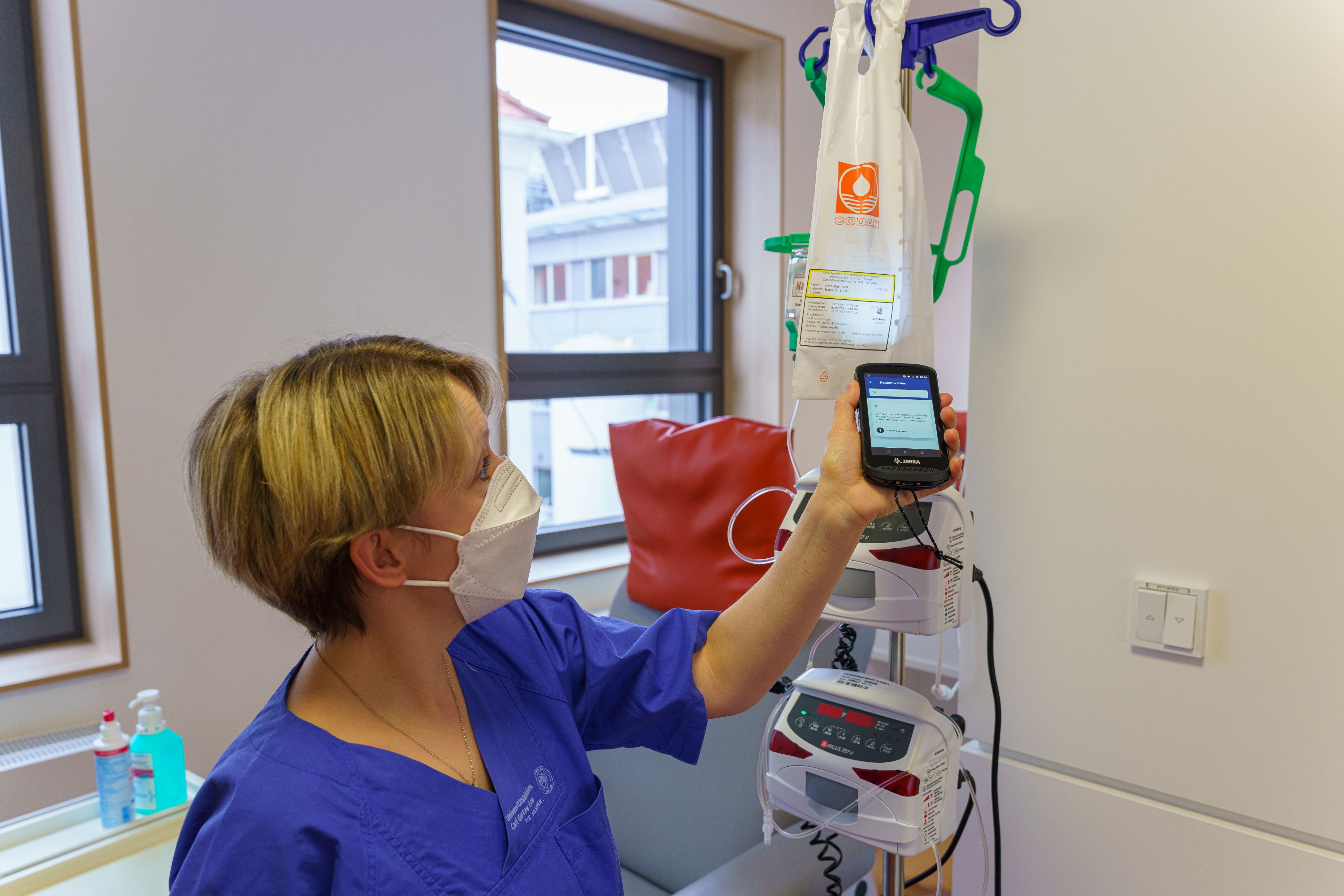 Auch die Verabreichung der Medikamente wird lückenlos dokumentiert: Über eine spezielle App („BD Cato ReadyMed“) können Pflegekräfte auf einem mobilen Endgerät mit zusätzlicher Handscanner-Funktion den Therapieplan des jeweiligen Patienten aufrufen. Der Plan zeigt an, in welcher Reihenfolge und zu welchem Zeitpunkt welches Medikament verabreicht werden muss. Soll ein bestimmtes Medikament verabreicht werden, scannt die Pflegekraft den Barcode auf dem entsprechenden Krebsmedikament. Anschließend wird ein patientenspezifischer Barcode gescannt. Dieser wird individuell für jeden Patienten generiert und auf dem Patientenarmband aufgedruckt. Bei stationären Patienten sind entsprechende Armbänder schon seit Längerem im Einsatz, in der Tagesklinik werden sie derzeit eingeführt. Das System prüft automatisch, ob Medikament und Patient zusammenpassen, ob die Reihenfolge der Verabreichung korrekt ist oder das Verfallsdatum des Medikaments überschritten ist. Nur wenn alles in Ordnung ist, gibt das System grünes Licht für die Verabreichung des Medikaments. Auch für Medikamente, die nicht über die Klinik-Apotheke hergestellt und dort mit einem Barcode versehen wurden, kann jeweils ein individueller Barcode ausgedruckt und gescannt werden.