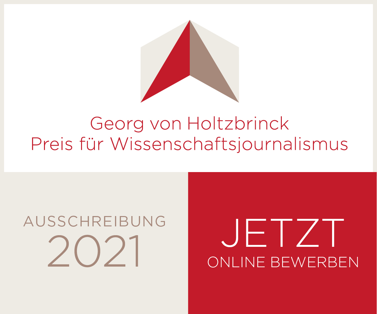 Die aktuelle Ausschreibung 2021 für den Georg von Holtzbrinck Preis für Wissenschaftsjournalismus endet am 4. April 2021 um 24 Uhr. In deutschsprachigen Medien publizierende Journalist*innen können sich in den drei Kategorien Text, Elektronische Medien und Nachwuchs bewerben. Die Preise für die Kategorien Text und Elektronische Medien sind mit 10.000 € dotiert, der Nachwuchspreis mit 5.000 €. Die Beiträge sollen allgemein verständlich sein und zur Popularisierung wissenschaftlicher Sachverhalte, insbesondere aus den Bereichen Naturwissenschaften, Technologie und Medizin, beitragen. Entscheidend ist die originelle journalistische Bearbeitung aktueller wissenschaftlicher Themen.