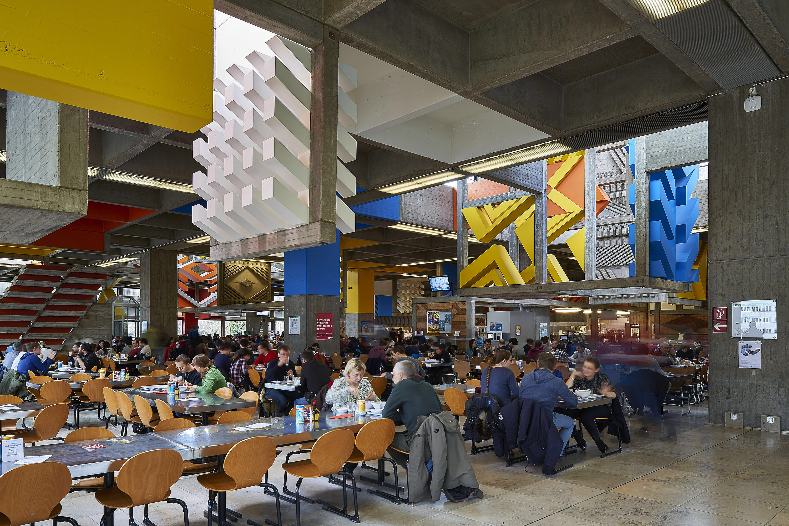 Von 1965 bis 1970 errichtete der Architekt Walter Schrempf die Mensa auf dem Saarbrücker Campus als 60 mal 60 Meter großen Kubus aus Sichtbeton, Holz, Natursteinboden und Glas. Gemeinsam mit dem Bildhauer Otto Herbert Hajek entstand ein begehbares Gesamtkunstwerk mit großen, farbigen Raumskulpturen, das 1969 mit dem BDA-Preis für Architektur ausgezeichnet und 1997 unter Denkmalschutz gestellt wurde. „Neben einer virtuellen und analogen Ausstellung in der Mensa sowie einem Ausstellungskatalog und einem Workshop zum Aufbau eines digitalen Bauarchivs im Saarland in Vernetzung mit der Großregion bildet die Vortragsreihe die wissenschaftliche Kernveranstaltung des Gesamtprojekts“, erläutert Projektleiterin Dr. Mona Schrempf, Tochter des 1998 verstorbenen Architekten der Mensa. Die Kulturanthropologin hat eine wissenschaftliche Veranstaltungsreihe mit einem künstlerischen Rahmenprogramm konzipiert, das die Mensa bis zum Sommer 2022 auf vielfältige Art neu erlebbar machen will. Eine digitale Web-App mit einem virtuell begehbaren 3-D-Modell macht den Speisesaal entlang einer begleitenden „ArchitekTour“ und einem historischen Bilderarchiv zur Mensa audiovisuell und interaktiv erfahrbar; eine per QR-Codes mit der Web-App verknüpfte Dauerausstellung führt vor Ort durch die Mensa, und schließlich sollen zwei Mensa Beats Konzerte und eine internationale Tanztheateraufführung die Mensa als Performance-Raum wiederbeleben.