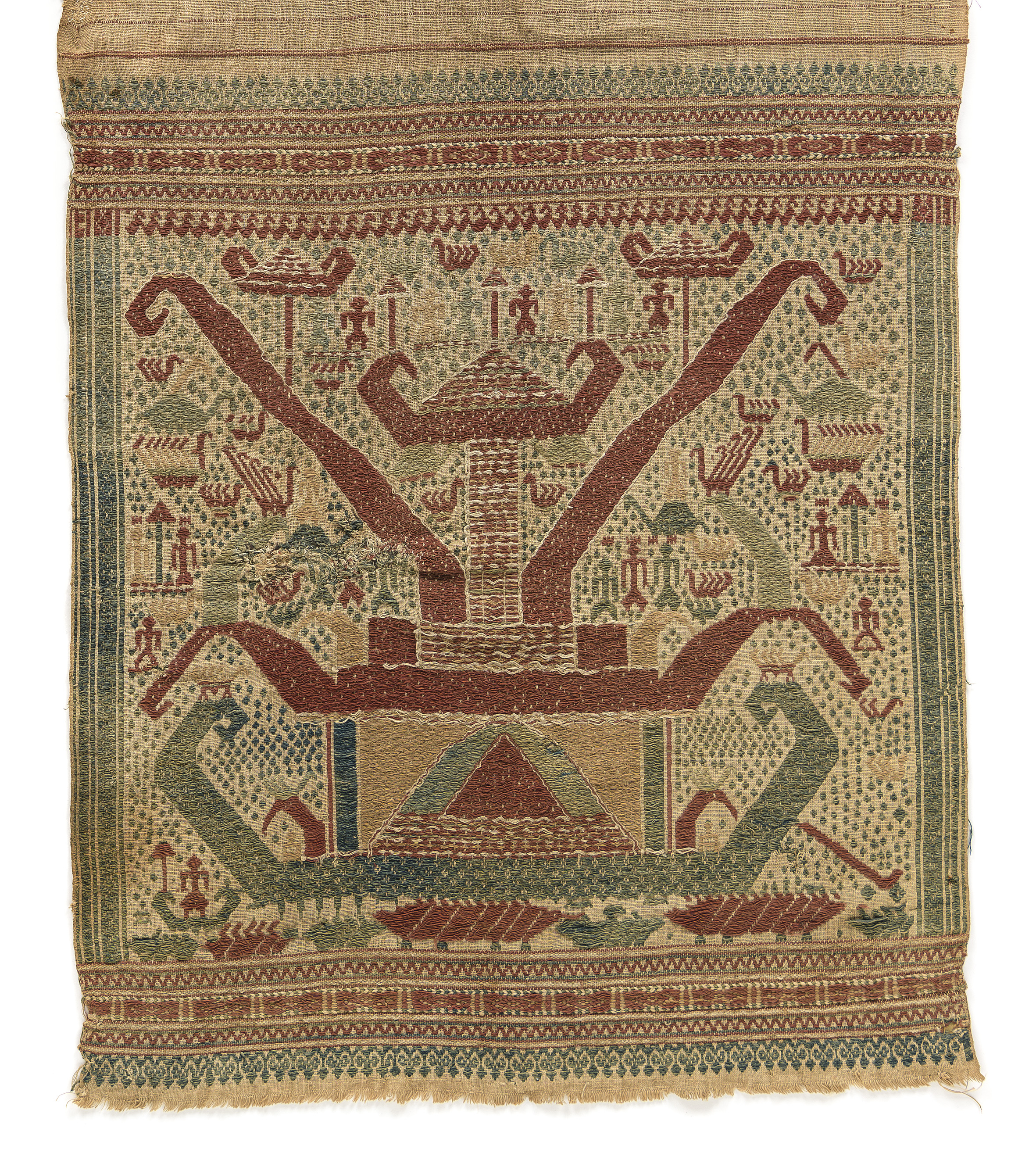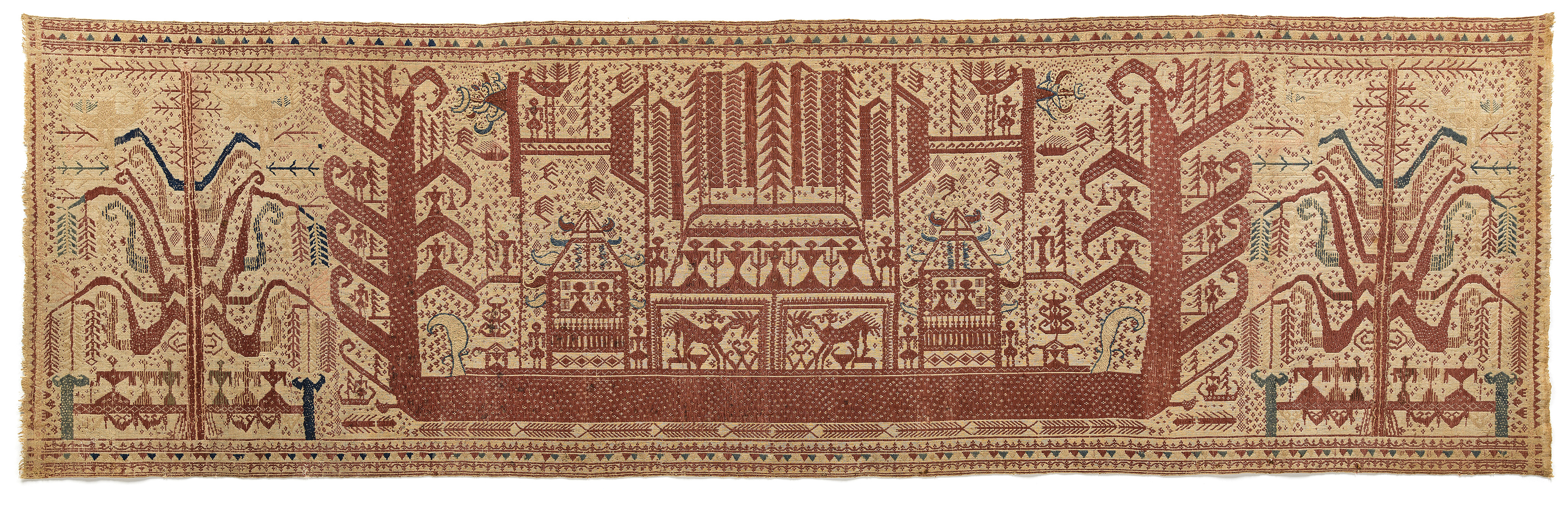 Schiffe, irgendwo zwischen Wasser und Himmel, oft mehrfach übereinander gestapelt, mit Ahnenwesen, glücksverheissenden Tieren oder mit mächtigen Insignien geschmückt: So präsentieren sich die textilen Motive, die es ab dem 11. April 2021 im Völkerkundemuseum der Universität Zürich zu bestaunen gibt. Weberinnen Südsumatras erzeugten die ausdrucksstarken Bilder und kühnen Muster mit rot, blau und gelb gefärbten Fäden, die sie – meist zu zweit zusammenarbeitend – in einer raffinierten Technik direkt mit dem baumwollenen Grundstoff verwoben.