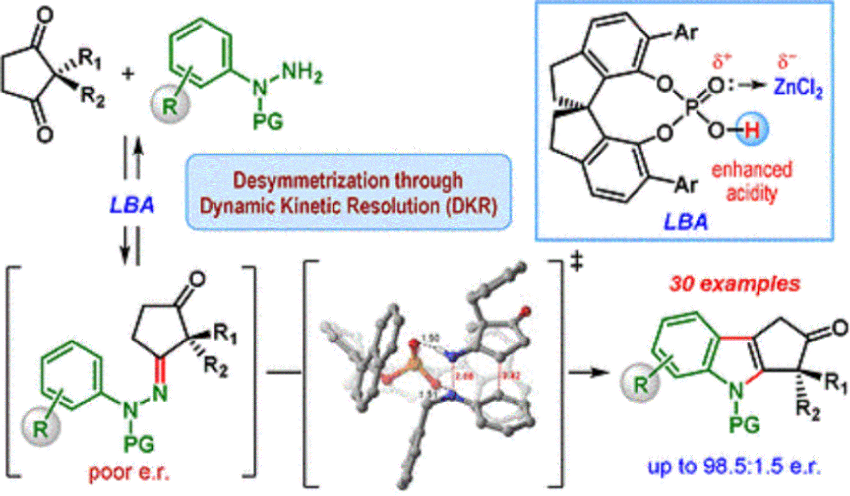 Herzstück des Reaktionsmechanismus ist eine sogenannte dynamische kinetische Trennung: Im Verlauf der Reaktion entsteht zunächst ein chirales Hydrazon als Zwischenprodukt – in beiden enantiomeren Formen. Dieser Schritt ist reversibel, sodass sich die beiden enantiomeren Hydrazone im Verlauf der Reaktion ineinander umwandeln können. Die Weiterreaktion der Hydrazone zu den Indol-Derivaten ist die eigentliche katalytische Reaktion. Diese verläuft mit einem der Hydrazon-Enantiomere wesentlich schneller in Vergleich zum anderen. Ursache ist eine günstigere Geometrie bei der Bindung an den chiralen Katalysator. Das andere Hydrazon-Enantiomer reagiert sehr langsam, sodass nur eine kleine Menge des Indol-Produkts entsteht. Stattdessen wandelt sich das langsam reagierende Hydrazon-Enantiomer in das schnell reagierende Hydrazon-Enantiomer um, was dazu führt, dass das Gleichgewicht letztlich in Richtung des Cyclopentan[b]indol-Produkts verschoben wird.