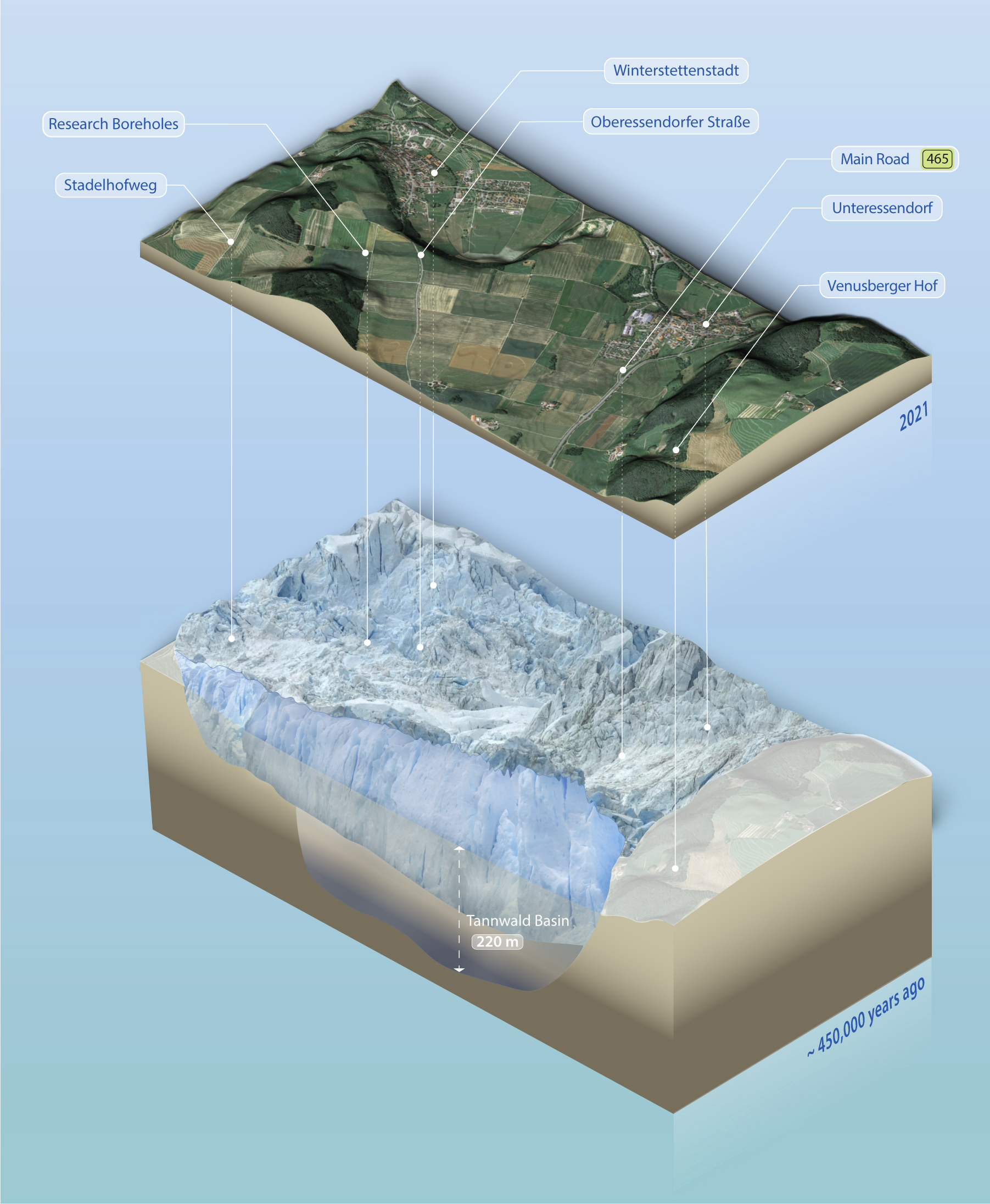 How did the climate in the Alpine region change during the ice ages and shape glaciers, flora and fauna over the millennia? In April, the Leibniz Institute for Applied Geophysics (LIAG), in cooperation with the Albert Ludwig University of Freiburg and the Geological Survey in Freiburg (LGRB), will start three research boreholes southeast of Winterstettenstadt, Germany. The boreholes, which will be 160 metres deep, mark the start of the international project "DOVE - Drilling Overdeepened Alpine Valleys". The aim of this project is to reconstruct the spatial and temporal climate development during the ice ages in the entire Alpine region over the past 2.6 million years.