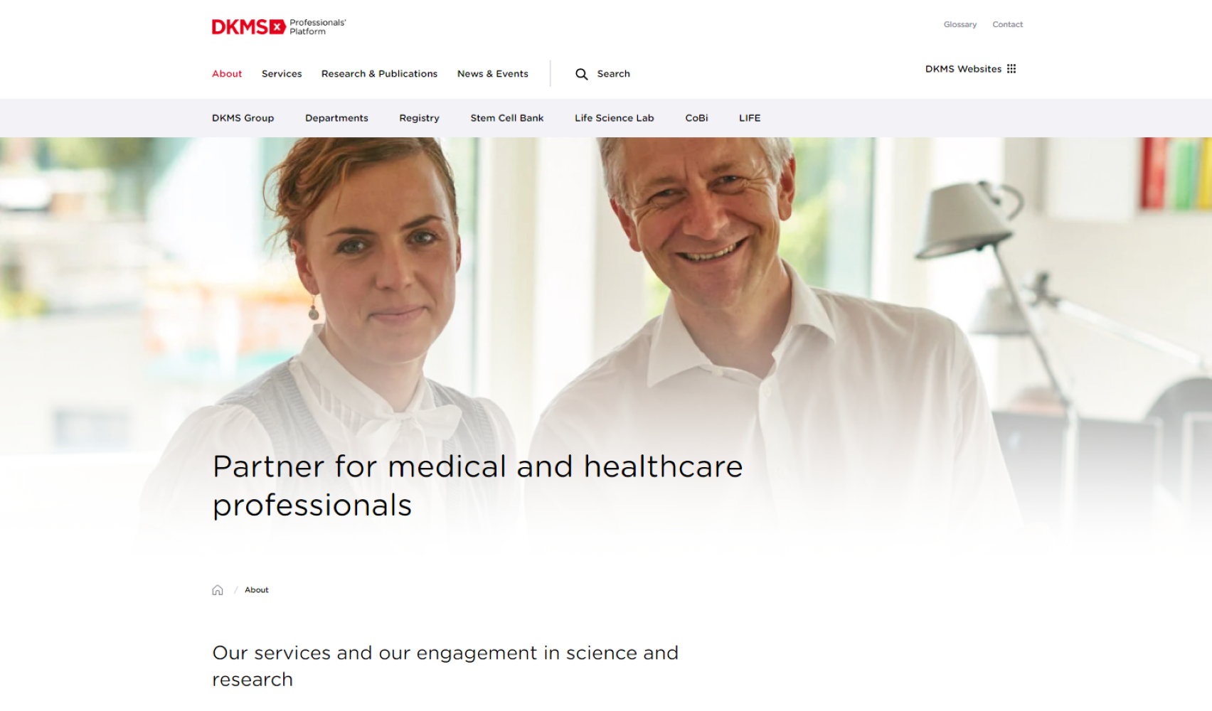 DKMS invites medical and healthcare professionals working in hematopoietic stem cell transplantation to visit the newly developed DKMS platform at www.professional.dkms.org. This website gives an overview of the work of all our specialist departments and offers comprehensive insights into the non-profit organization’s scientific studies and publications. Furthermore, it provides access to DKMS’ services, resources, grants and support programs. The site features a modern and streamlined design and makes it easy to access essential information.