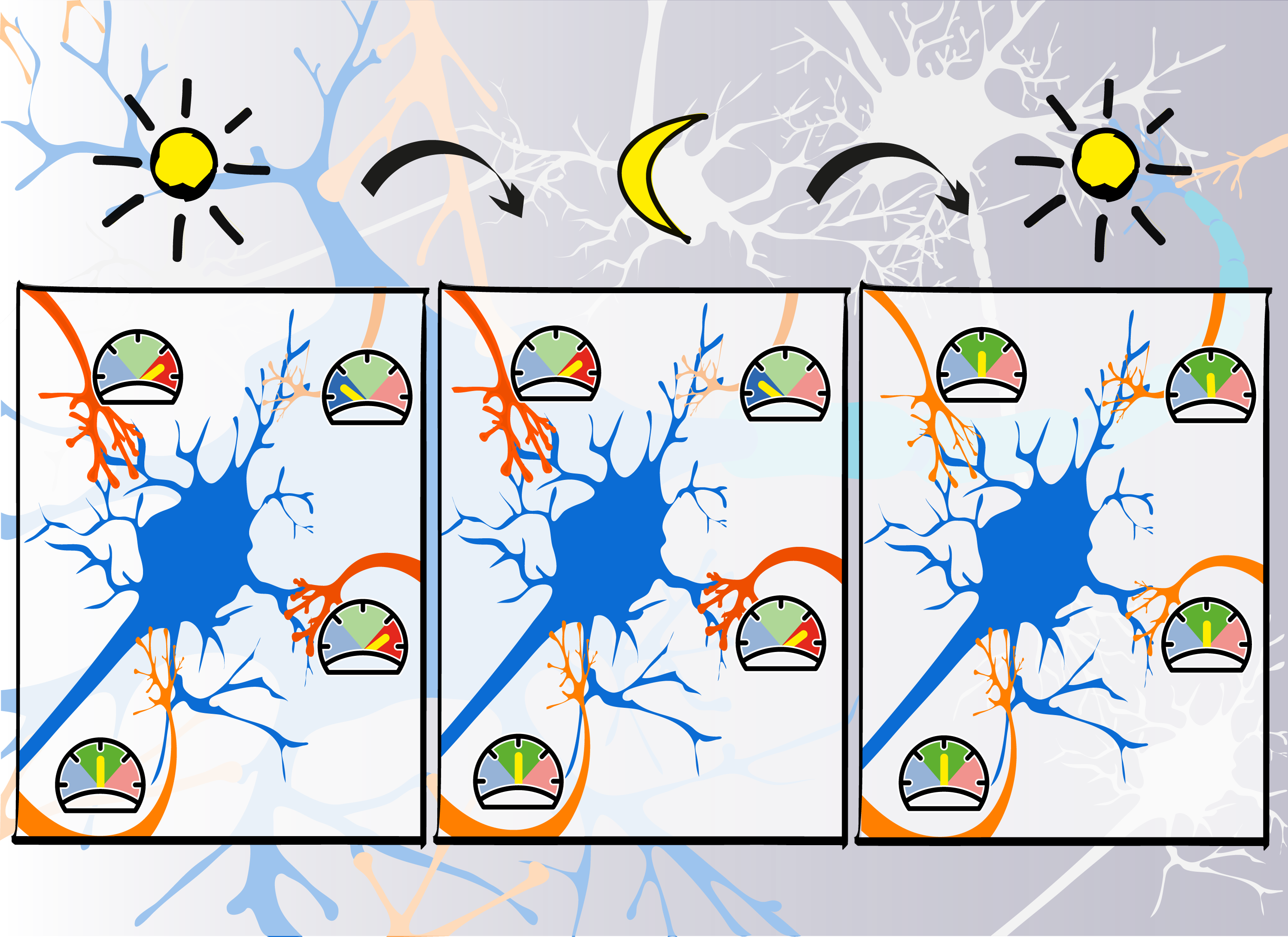Vereinfachtes Modell lernender biologischer Nervenzellen. Am Ende einer wachen Periode (linke Abbildung) sind synaptische Verbindungen zu Neuronen verstärkt oder abgeschwächt entsprechend dem kurzfristig Erlernten. Gelernte Reize werden in der Schlafperiode (mittlere Abbildung) bewertet und angepasst, dabei werden die entsprechenden synaptischen Verbindungen auf ein mittleres Niveau skaliert. Die letzte Phase (rechte Abbildung) zeigt die angeglichenen Verbindungen zu Beginn der nächsten wachen Periode. Dieser Prozess wurde jetzt auf künstliche neuronale Netze übertragen und steigert deren Leistungsfähigkeit deutlich.