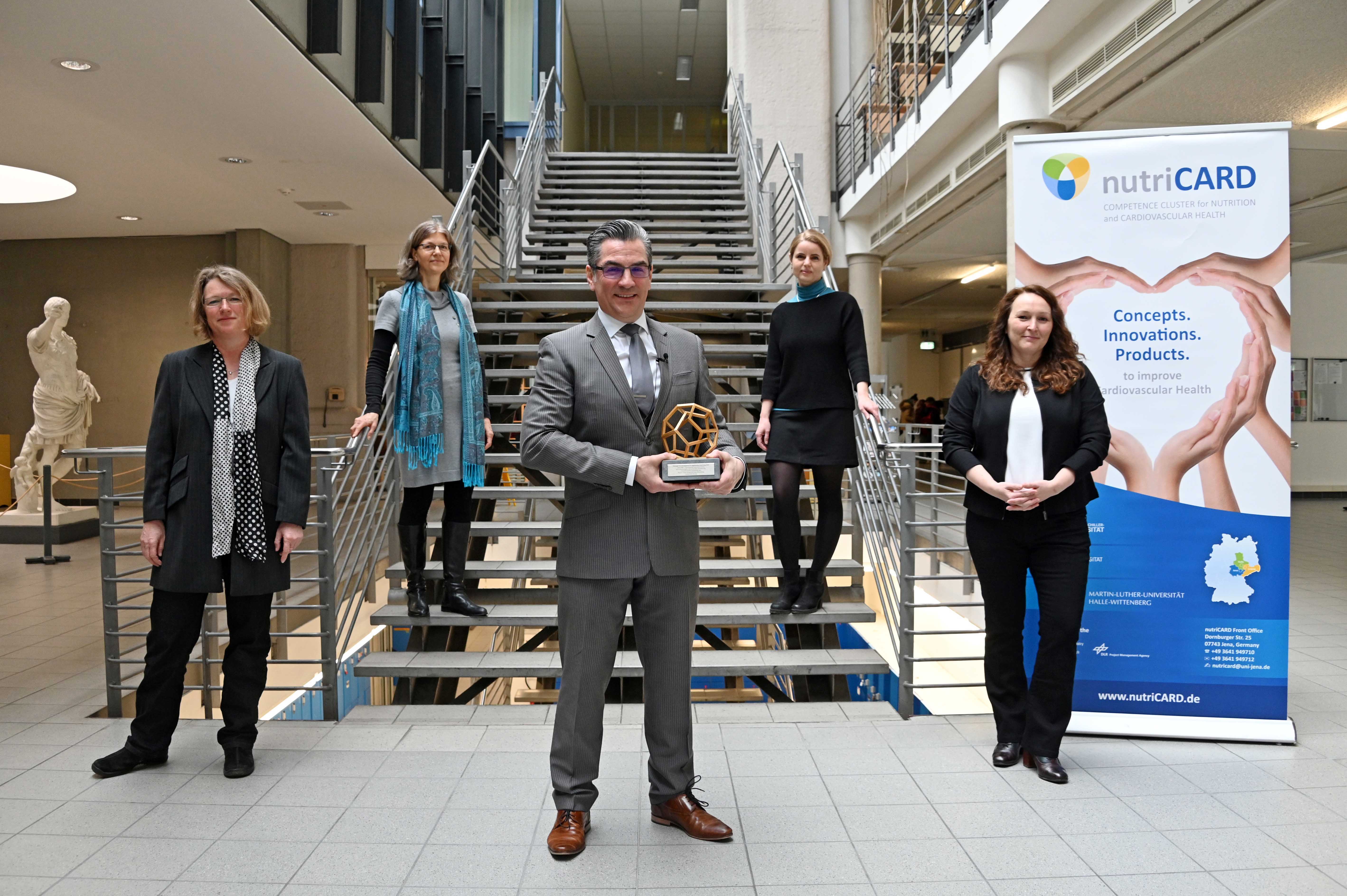 Die weltweit häufigste Todesursache sind Herz-Kreislauf-Erkrankungen; mehr als vier Millionen Menschen sterben jährlich in Europa an deren Folgen. Jeder zweite bis dritte vorzeitige Todesfall ließe sich durch eine ausgewogene Ernährung vermeiden. Das sind einige der alarmierenden Befunde aus der Arbeit von nutriCARD. „Wir wissen heute sehr gut Bescheid über die gesundheitsfördernde Wirkung bestimmter Nahrungsmittel und das schädliche Potenzial anderer“, sagt Prof. Dr. Stefan Lorkowski. „Die Herausforderung besteht darin, diese Erkenntnisse aus der Grundlagenforschung in Rezepturen von Lebensmitteln und in Ernährungskonzepte zu überführen und diese verständlich und alltagstauglich an die Verbraucherinnen und Verbraucher zu kommunizieren“, so der Professor für Biochemie und Physiologie der Ernährung der Universität Jena. Genau das ist der Ansatz von nutriCARD. „Langfristiges Ziel ist der Aufbau eines gemeinschaftlich getragenen Mitteldeutschen Zentrums für Ernährung und Gesundheit, das für die gesamte Bevölkerung in allen Lebensphasen Strategien für eine ausgewogenere Ernährung bereitstellt", erläutert Lorkowski. Er dankte stellvertretend für alle Preisträger dem Land Thüringen und sieht den Preis als Ansporn, die Forschungs- und Entwicklungsarbeiten von nutriCARD mit großem Engagement weiterzuführen.