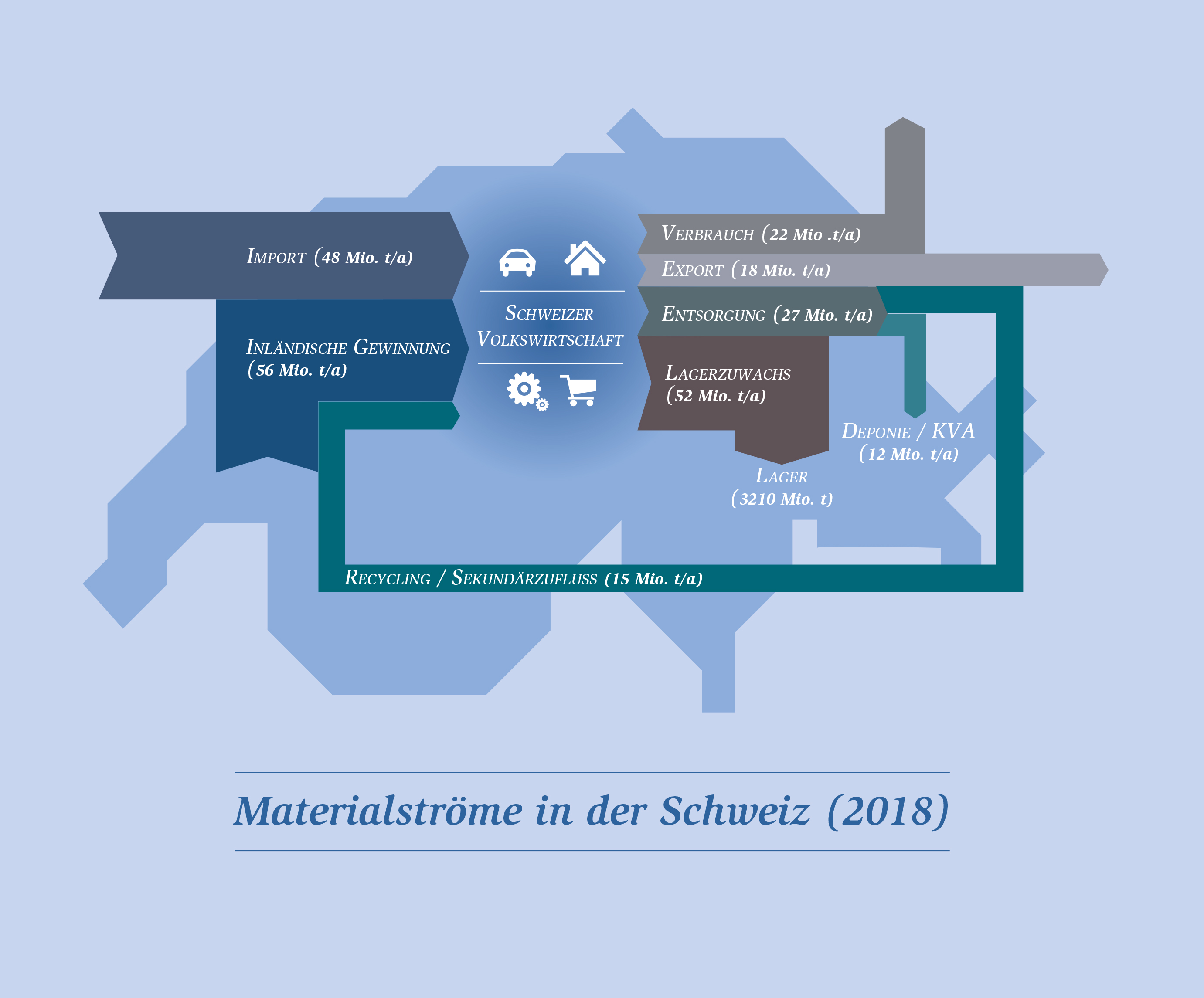 Dieses Datenmosaik fasst nun der vierte Teil zusammen: ein Synthesebericht als Momentaufnahme der Massen- und Energieflüsse für das Jahr 2018. Einige Kennzahlen daraus: Der inländische Materialkonsum beträgt netto pro Jahr 87 Millionen Tonnen: die nötige Masse, um die Schweizer Volkswirtschaft am Laufen zu halten. Beispiele für abfliessende Massen: 12 Millionen Tonnen gelangten in die endgültige Entsorgung; der Export belief sich auf 18 Millionen Tonnen.