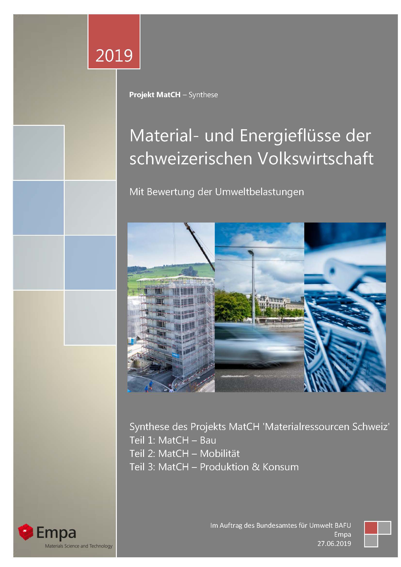 Der Bericht «Material- und Energieflüsse der schweizerischen Volkswirtschaft» deckt die gesamte Volkswirtschaft der Schweiz ab und fasst die Berichte der MatCH-Trilogie «Bau» (2016), «Mobilität» (2017) und «Produktion & Konsum» (2018) zusammen.