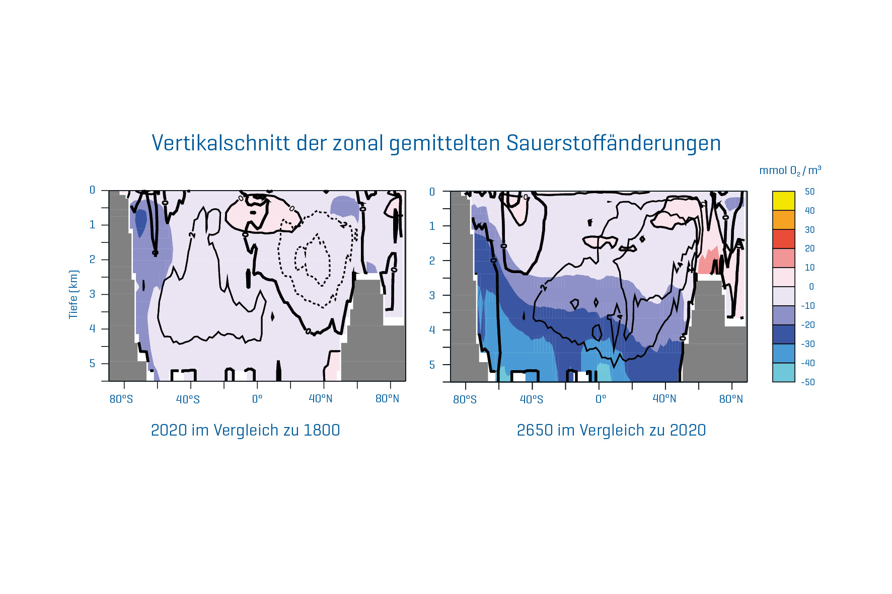 Das Leben praktisch aller Tiere im Meer hängt von der Verfügbarkeit von Sauerstoff ab, das als Gas im Meerwasser gelöst ist. Doch schon seit einigen Jahrzehnten verliert der Ozean kontinuierlich Sauerstoff. In den letzten 50 Jahren global gesehen etwa 2% des Gesamtinventars (regional zum Teil deutlich mehr). Hauptgrund dafür ist die globale Erwärmung, die zu einer Abnahme der Löslichkeit von Gasen und damit auch von Sauerstoff sowie zu einer Verlangsamung der Umwälzbewegung des Ozeans und damit der Belüftung führt. Eine neue Studie, die heute in der internationalen Fachzeitschrift Nature Communications erschienen ist, zeigt, dass dieser Prozess sich noch über Jahrhunderte fortsetzen wird, selbst wenn alle CO2-Emissionen und damit die Erwärmung an der Erdoberfläche sofort gestoppt werden würden.