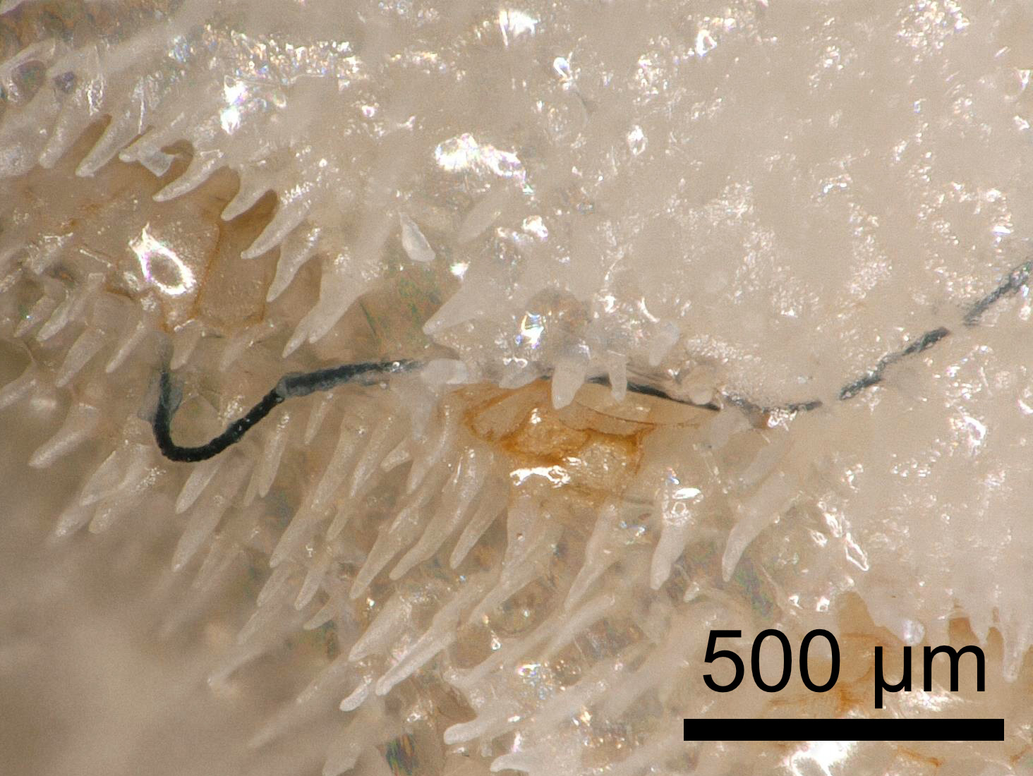 The experiments showed that coral polyps can recognize the foreign bodies as such and excrete them again. However, they also revealed that the plastic particles had not found their way out of the oral cavity in all cases. In about one third of the thin sections examined, one or more particles were found directly at the transition to the coral calcium skeleton, or they were already incorporated there.