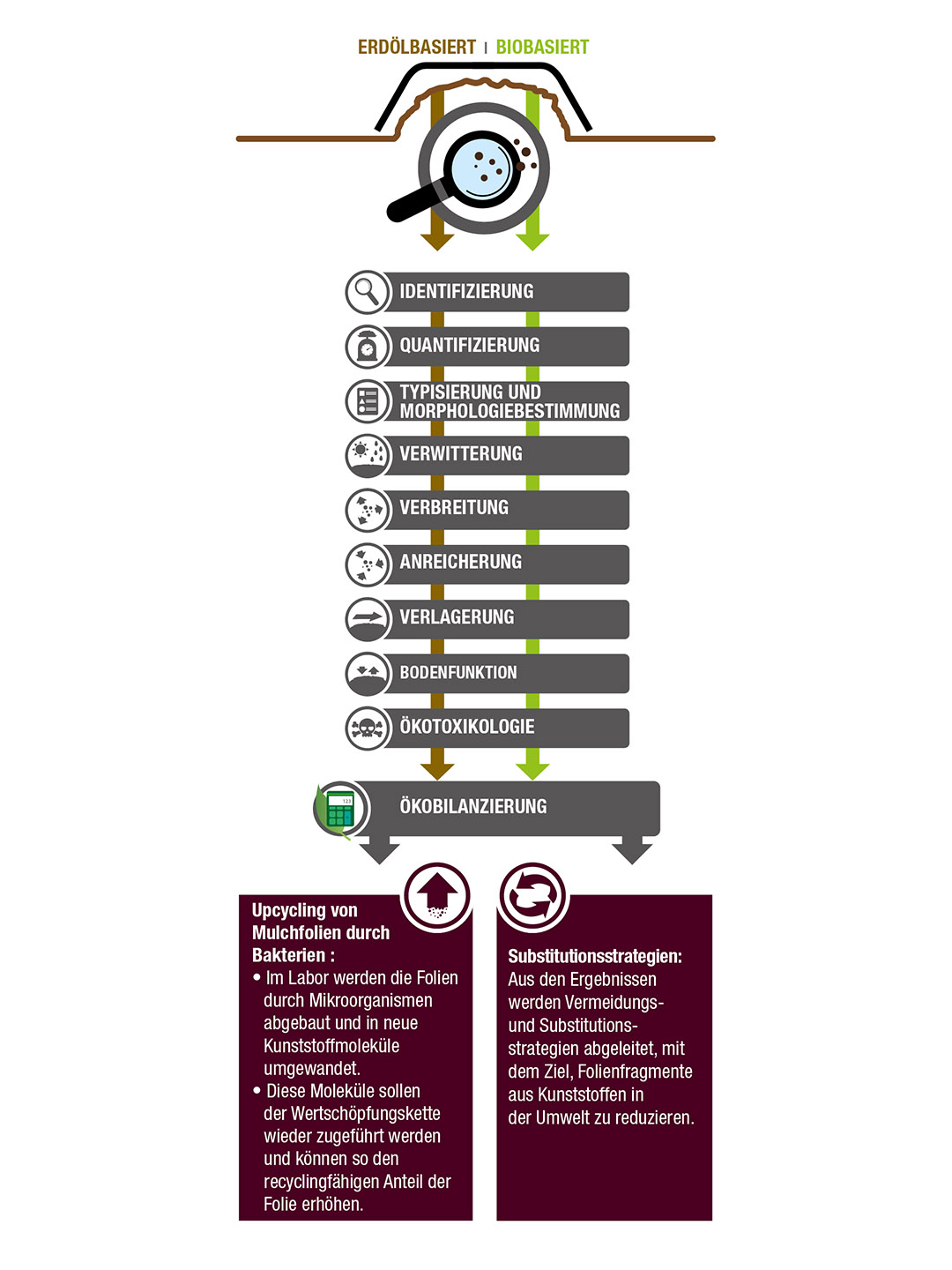 Um die verbleibenden Fragen über Kunststoffe in Böden zu klären, erfoscht das Projekt iMulch auch, wie Kunststoffe im Ökosystem Boden verwittern, wie sich die Partikel im Boden verbreiten und welche Auswirkungen Kunststoffe auf Organismen, Bodenfunktion, Wässer aus Drainagesystemen und angrenzende Gewässer haben. Außerdem wird eine Ökobilanz der Umweltverträglichkeit von konventionellen und biologisch abbaubaren Folien erstellt. Ein weiterer Ansatz beschäftigt sich mit dem Upcycling von Mulchfolien durch Bakterien.