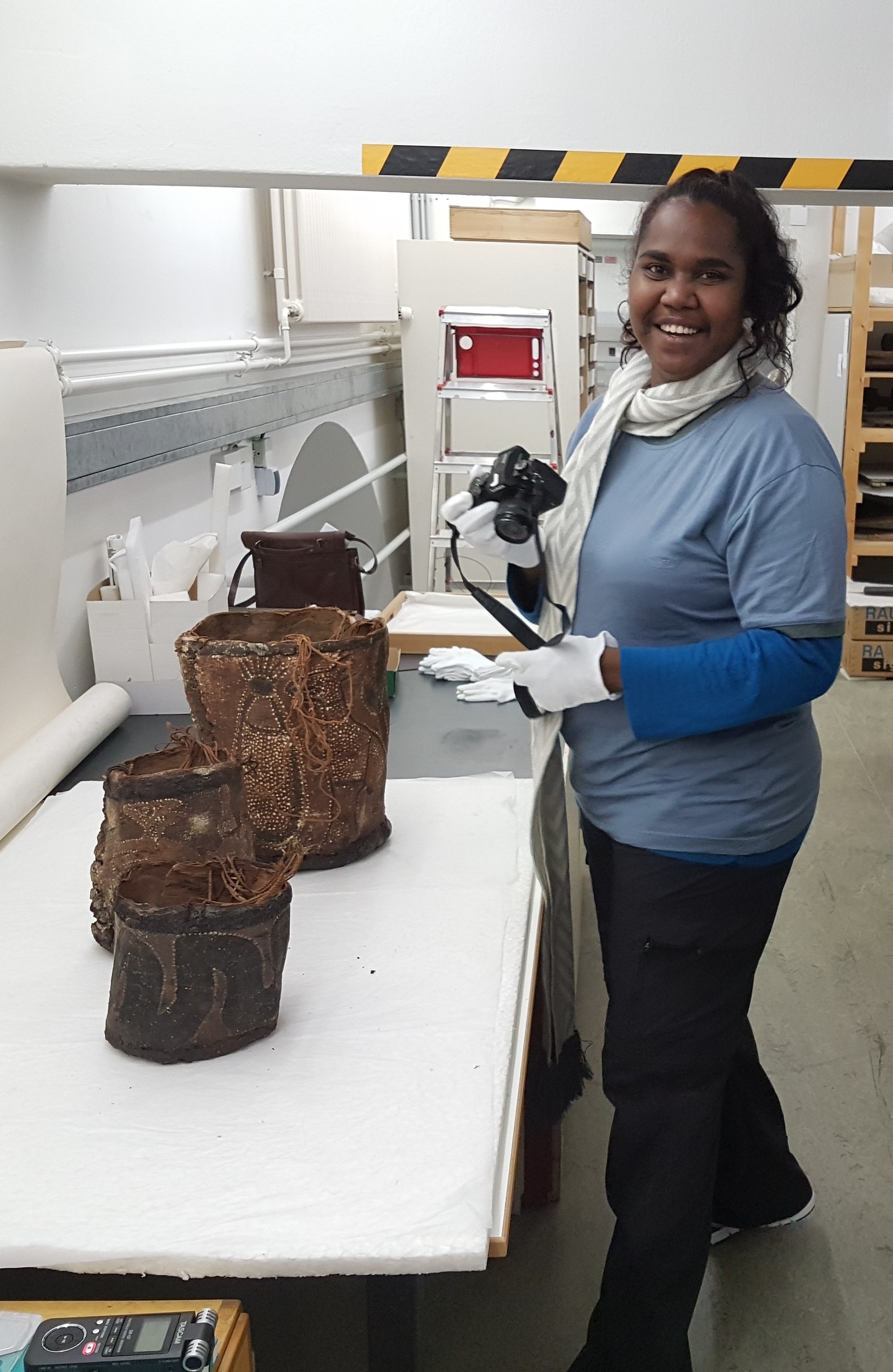 Bild 1: Projektpartnerin Leonie Cheinmora inspiziert die Objekte im Depot des Museums Fünf Kontinente in München. (Foto: Martin Porr)
