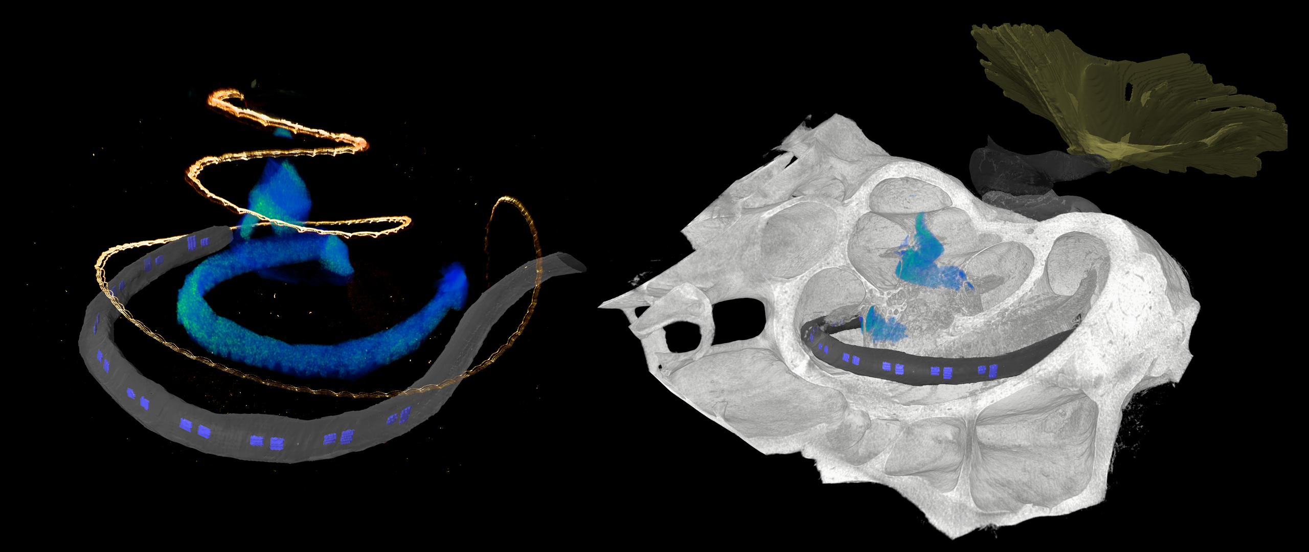 The development of optical cochlear implants is a complex undertaking that involves many researchers from different disciplines, from research in basic principles to clinical applications. One factor is the complicated structure of the cochlea, which is poorly accessible for investigation, even by imaging because it is deeply embedded in the temporal bone. However, detailed knowledge of the structure of the cochlea is critical for the development of innovative therapy of deafness. Researchers rely on animal studies to develop the gene therapy and optical cochlear implants and to test their efficacy and safety. Suitable animal models include rodents such as mouse, rat, gerbil, and as research progresses, non-human primates. At DPZ, the Auditory Neuroscience and Optogenetics Laboratory conducts research with common marmosets, whose behavior in vocal communication is similar to that of humans. "For (late) preclinical studies, detailed knowledge of the anatomy of the cochlea is necessary. We used phase-contrast X-ray tomography and light sheet fluorescence microscopy, as well as a combination of the two, to image the structure of the cochlea of both major rodent models and common marmosets," explained Daniel Keppeler, first author of the study. "For cross-scale and multimodal imaging, we developed special instruments and methods, both here in our lab and with synchrotron radiation," adds collaborating partner Tim Salditt, professor at the Institute of X-ray Physics at the University of Göttingen, who led the research team in X-ray tomography. "In this way, we were able to gain detailed insights into the anatomy of bones, tissues and nerve cells. These parameters are relevant for the development of implants specifically for these species," says Daniel Keppeler.