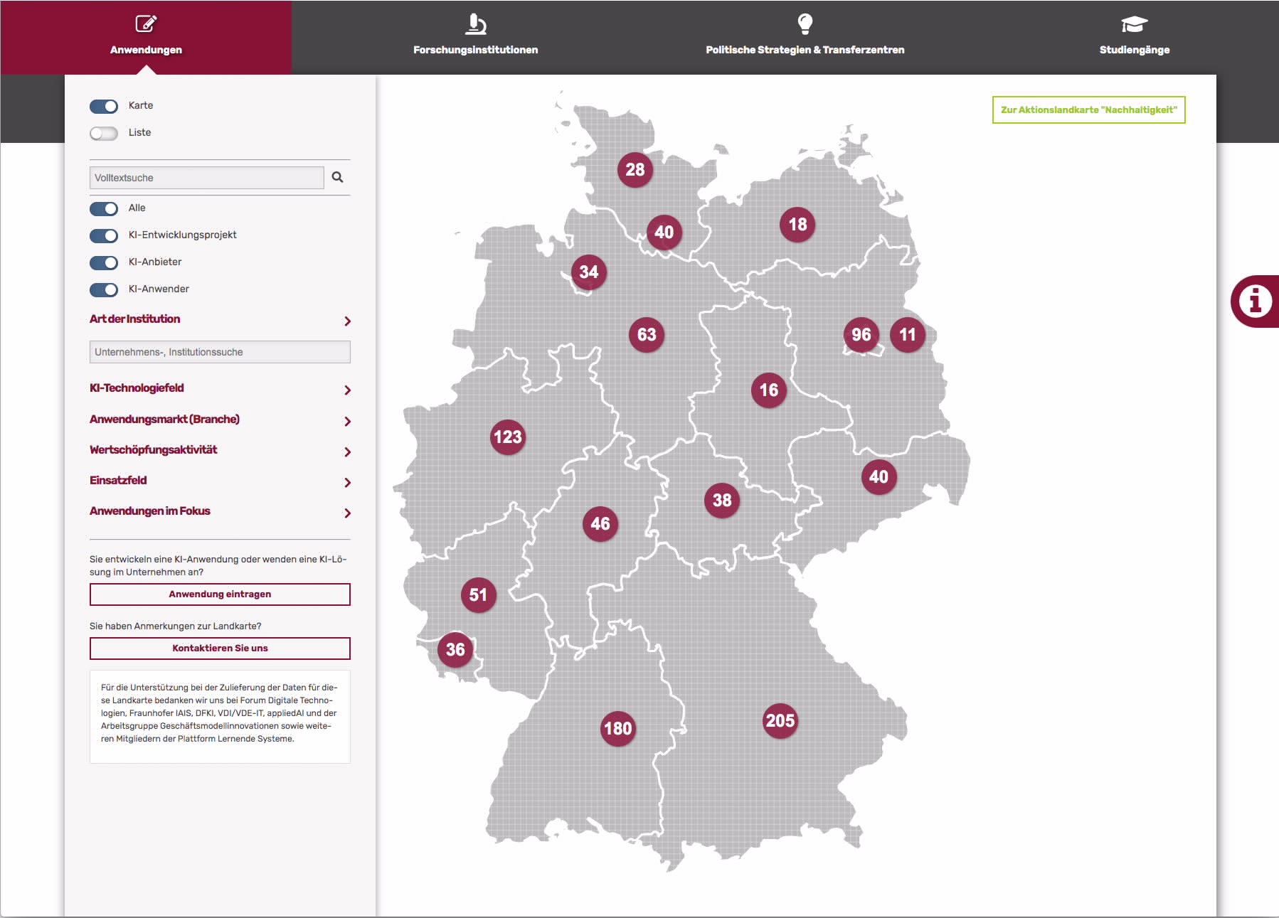 Insbesondere kleinen und mittleren Unternehmen, die sich bislang noch nicht mit Künstlicher Intelligenz beschäftigt haben, verschafft die KI-Landkarte einen Einblick in die vielfältigen Anwendungsmöglichkeiten. Welchen Beitrag KI zu einer nachhaltigen Entwicklung leisten kann, zeigt die Plattform Lernende Systeme auf einer separaten Aktionslandkarte Nachhaltigkeit. Diese listet aktuell mehr als 150 Anwendungen.