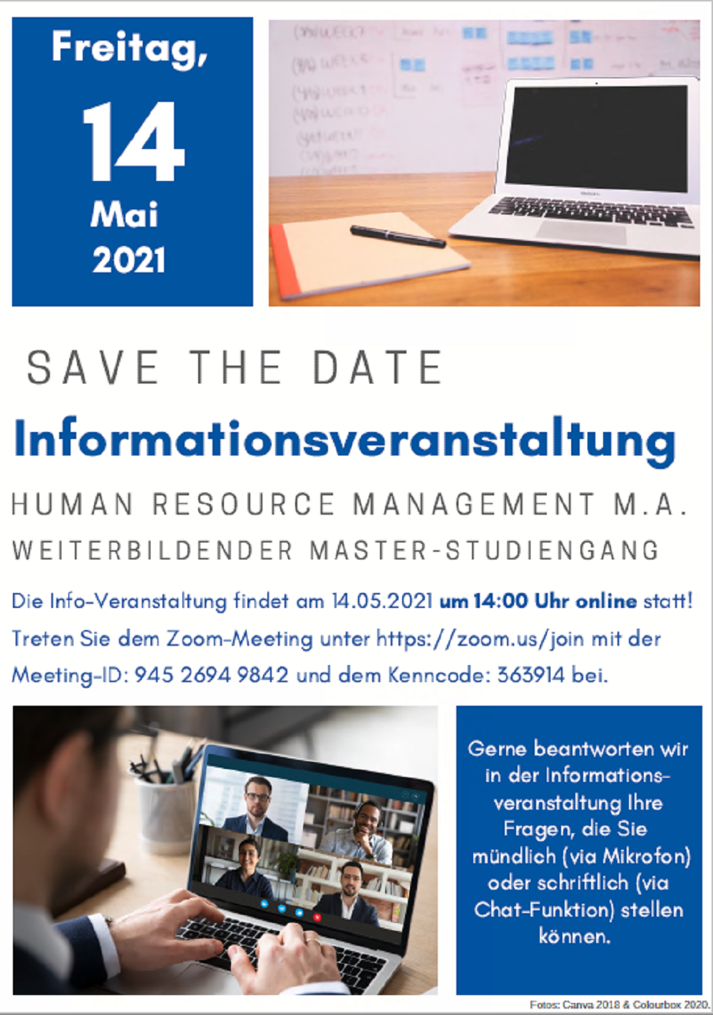 Interessierte, die neben dem Beruf einen qualifizierten Masterabschluss in Human Resource Management anstreben, können sich am Freitag, den 14. Mai 2021 bequem von zu Hause oder aus dem Büro online informieren. Die Hochschule Koblenz lädt zur kostenfreien Teilnahme am Zoom-Meeting ein: Das Fernstudien-Team stellt die Studieninhalte, den Ablauf und die Organisation des fünf-semestrigen Fernstudiums Human Resource Management (M.A.) ausführlich vor. Die Teilnehmenden haben dabei Gelegenheit live Fragen zu stellen – entweder mündlich oder schriftlich per Chat-Funktion. Alle Interessierten sind herzlich eingeladen dem Online-Meeting am 14. Mai, um 14:00 Uhr beizutreten unter: https://zoom.us/join, Meeting-ID: 945 2694 9842 und dem Kenncode 363914.