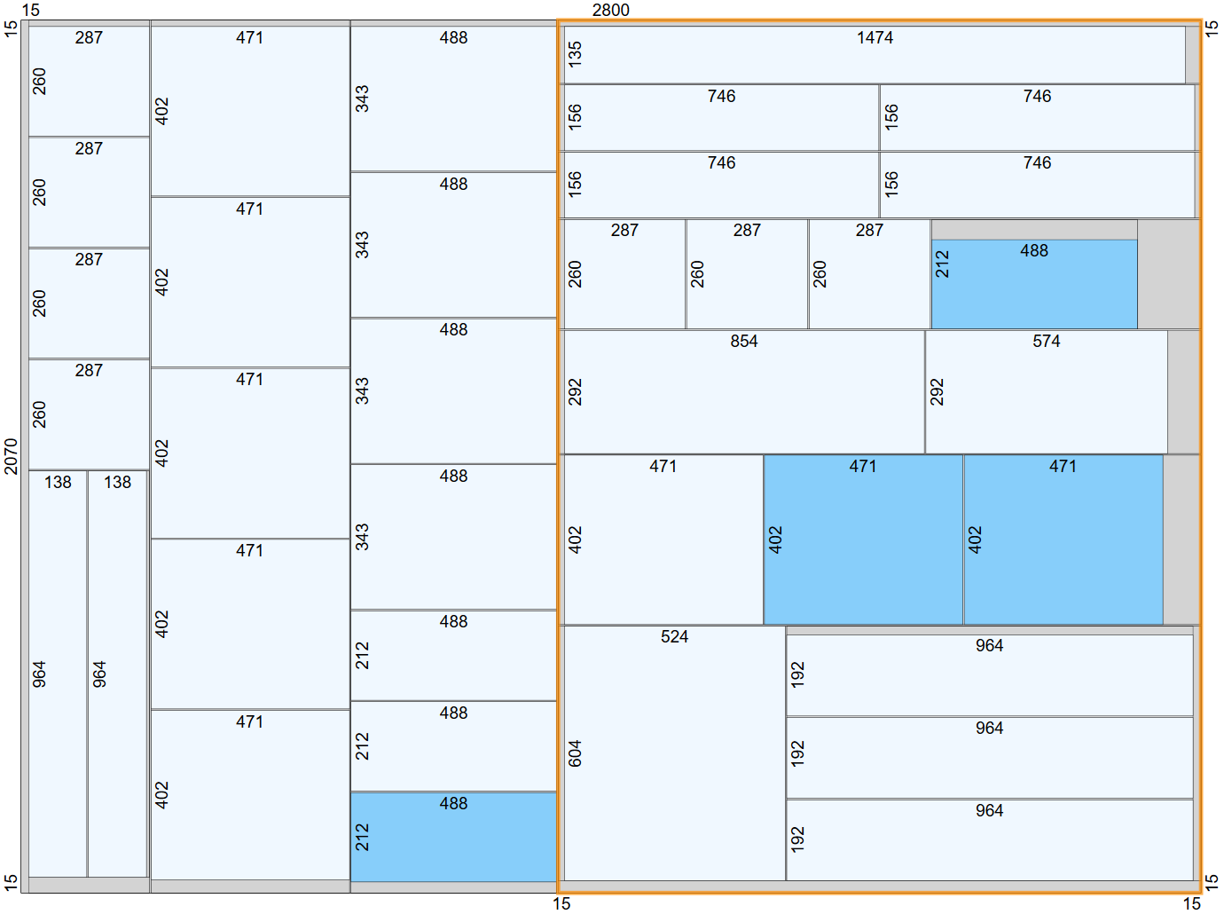 Die mit AutoPanelSizer erzeugten Schnittpläne erzielen bereits mit nur zwei Schnittebenen eine sehr hohe Materialausbeute. Durch Nach- und Kopfschnitte, eine dritte Schnittebene und die Berücksichtigung optionaler Teile wird der Verschnitt weiter reduziert. AutoPanelSizer lässt sich durch die Eingabe der jeweiligen Maschineneigenschaften an das Anwendungsszenario anpassen. Vordefinierte Fertigungsreihenfolgen oder eine begrenzte Zahl von Abstapelplätzen berücksichtigt die Software ebenfalls. Außerdem beachten die Optimierungsalgorithmen neben dem Materialverbrauch auch Fertigungskosten und Produktionszeiten – so können die Nutzer zwischen optimaler Materialausnutzung und Produktionsaufwand abwägen.
