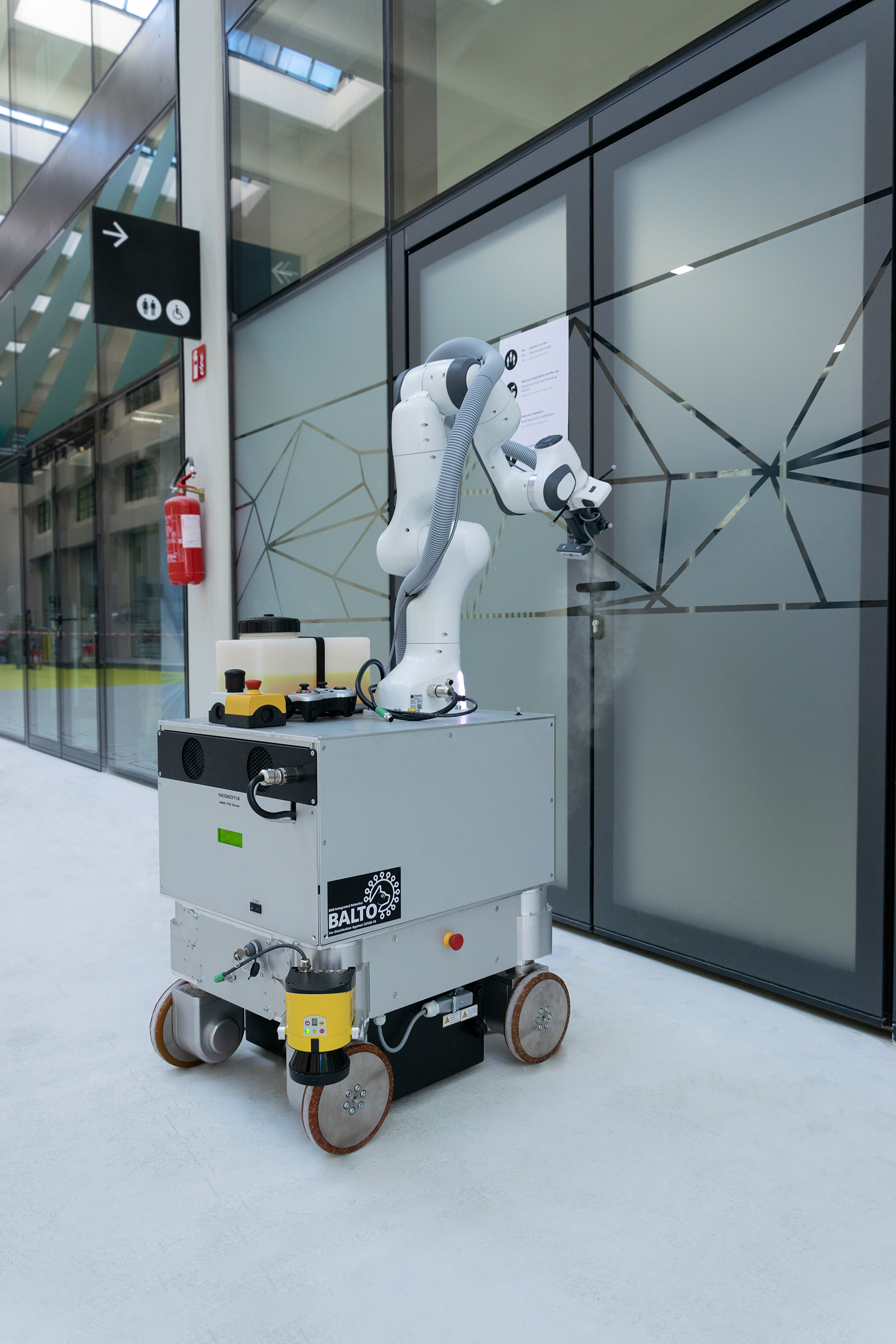 The disinfection robot BALTO — named after a sled dog who carried urgently needed vaccines to a highly inaccessible region of Alaska a hundred years ago — is capable of disinfecting door knobs and similar objects. It does this autonomously, reacting to human beings in the surrounding area at the same time. An interface with the Building Information Modeling (BIM) process makes this possible.