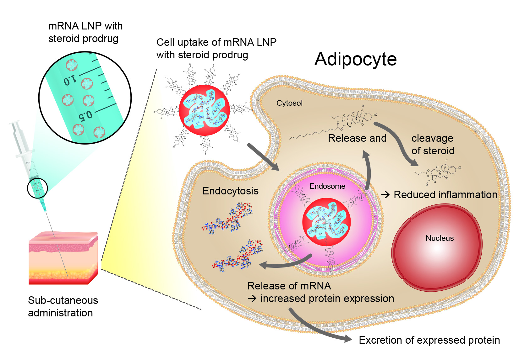 Bisher können jedoch nur geringe, unzureichende Mengen sicher subkutan injiziert werden. Wie sich das Problem lösen lässt, zeigen die aktuellen Untersuchungen der Forscher von AstraZeneca und vom Jülich Centre for Neutron Science (JCNS). Die Forscher ergänzten dabei die mRNA-Verpackungen um Vorstufen von entzündungshemmenden Substanzen aus der Klasse der Steroide. Körpereigene Enzyme können diese Vorstufen an Ort und Stelle der Injektion in wirksame Steroide umwandeln.