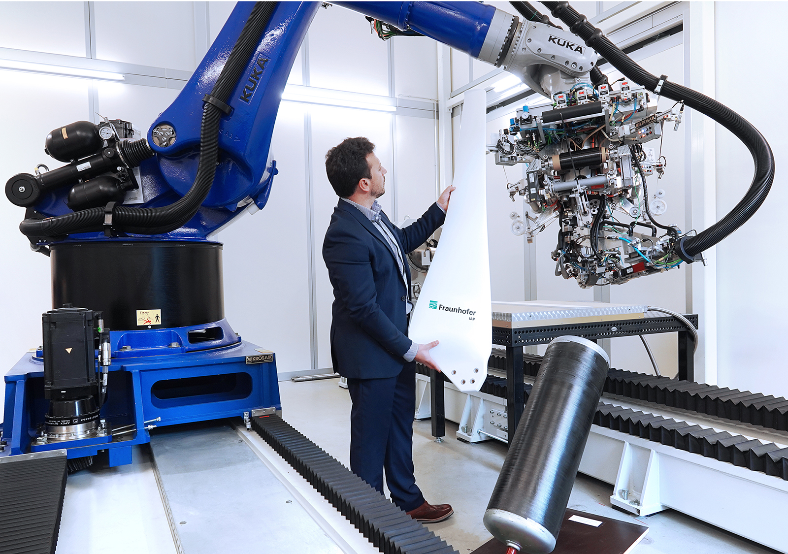 Fiber-reinforced composites are produced by precisely inserting fiber strips into a mold and then hardening them using a resin or alternative synthetic materials to form a component. The strips are often placed by hand. At Fraunhofer IAP, this job is done by a modern automated fiber placement machine that precisely positions the reinforcement fibers in the mold. Ambrosio: “The difference between this system and manual placement is that there are fewer overlaps, which allows us to significantly reduce the dimensions.”