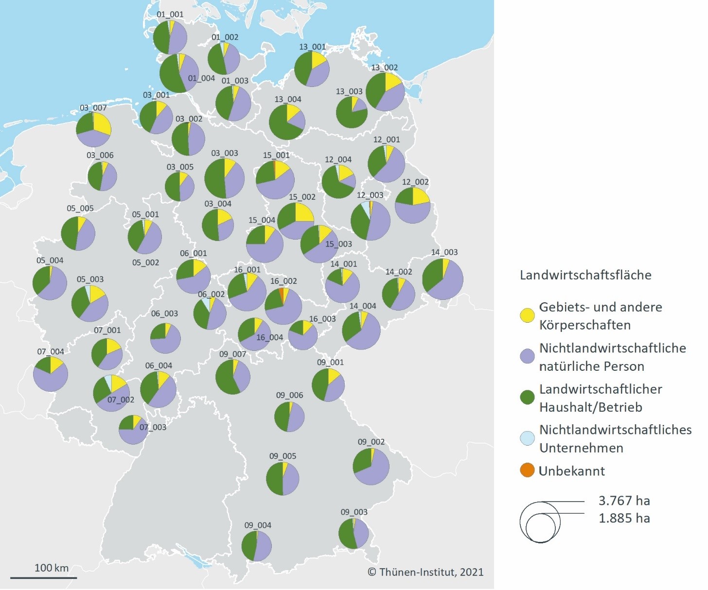 Landwirtschaftlichen Haushalten/Betrieben sind im Mittel 40 % (zwischen 17 % und 75 %) der Fläche zugeordnet. Zu dieser Gruppe zählen die landwirtschaftlichen Familienbetriebe, insbesondere in den ostdeutschen Bundesländern aber auch große GmbHs und Genossenschaften.