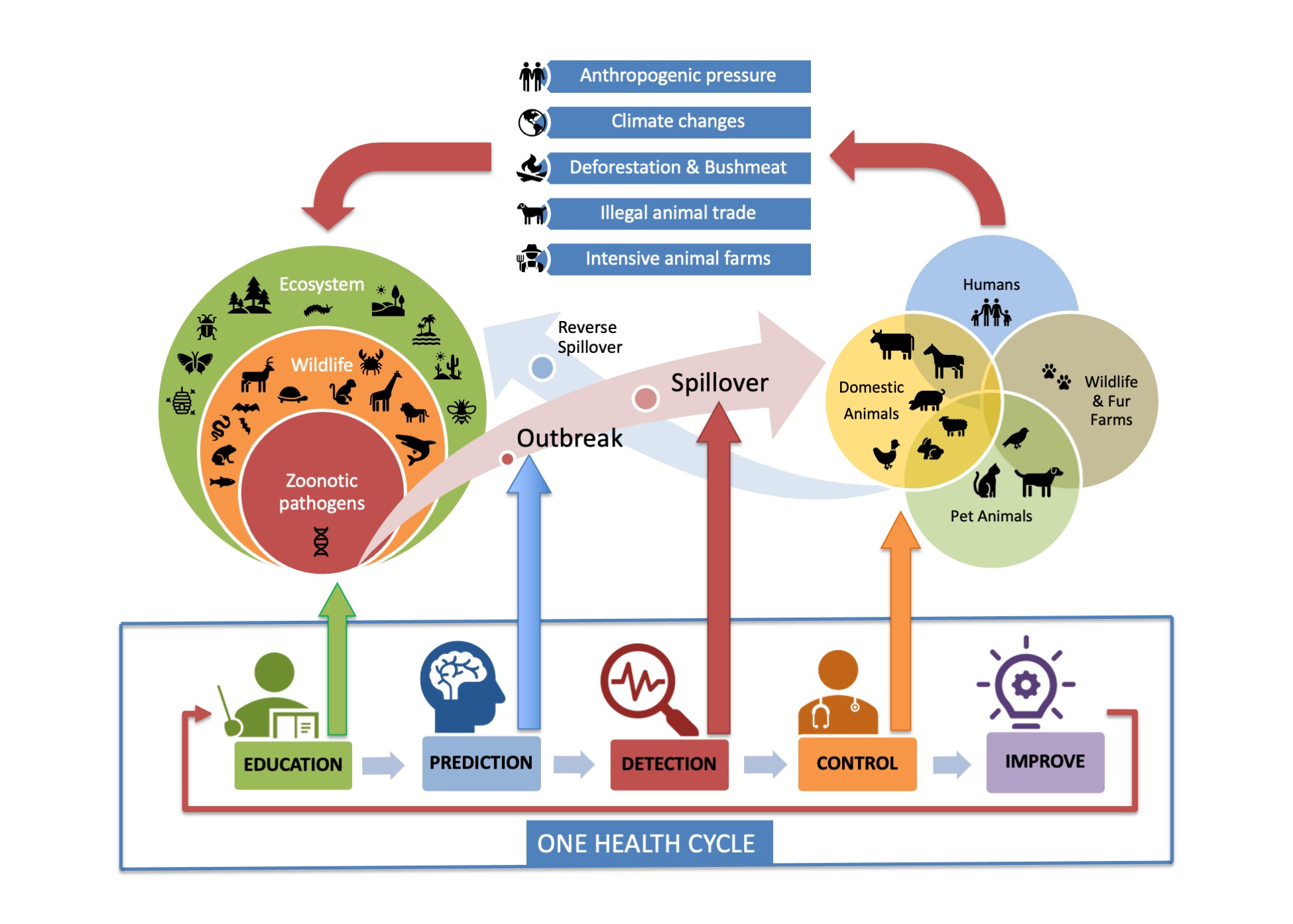 Mehr als 60 % der 1.700 bekannten Infektionskrankheiten, die auf den Menschen übertragbar sind, stammen von Tieren. Die wiederholten und häufigen zoonotischen Ausbrüche, wie die jüngste COVID-19-Pandemie, sind auf den Einfluss des Menschen auf die Natur zurückzuführen. Insbesondere die Schaffung riesiger intensiver Haustierfarmen, der häufige Einsatz von Antibiotika in intensiven Zuchtbetrieben, die Zerstörung von Wäldern, der Verzehr von Wildfleisch (Buschfleisch) und der „illegale Tierhandel“ sind Faktoren, die das Auftreten und die Übertragung von Krankheiten von Tieren auf Menschen begünstigen. „Früherziehungs- und Gesundheitspräventionsprogramme in Schulen, die die Zusammenhänge von Zoonosen im Rahmen des One Heath Konzeptes erklären, sind eine grundlegende Voraussetzung für die Gesundheit der Bevölkerung und die Vermeidung zukünftiger Pandemien“, erklärt Jeannette Wichert, Biologie- und Chemielehrerin am Robert Havemann Gymnasium in Berlin.