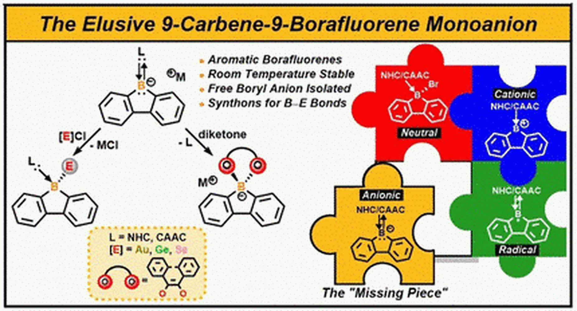 Ausgangspunkt des neuen Syntheseansatzes ist 9-Brom-9-Borfluoren, ein Borfluoren, an dessen Bor- ein Brom-Atom gebunden ist. Es wird mit einem sehr starken Reduktionsmittel (Kaliumgraphit, Natrium- bzw. Lithium-Naphthalid) behandelt – in Anwesenheit spezieller Carbene (organischer Verbindungen mit einem zweiwertigen Kohlenstoff-Atom und einem freien Elektronenpaar). Die bei der Reduktion gebildeten anionischen Borfluorene werden durch die Carbene stabilisiert.